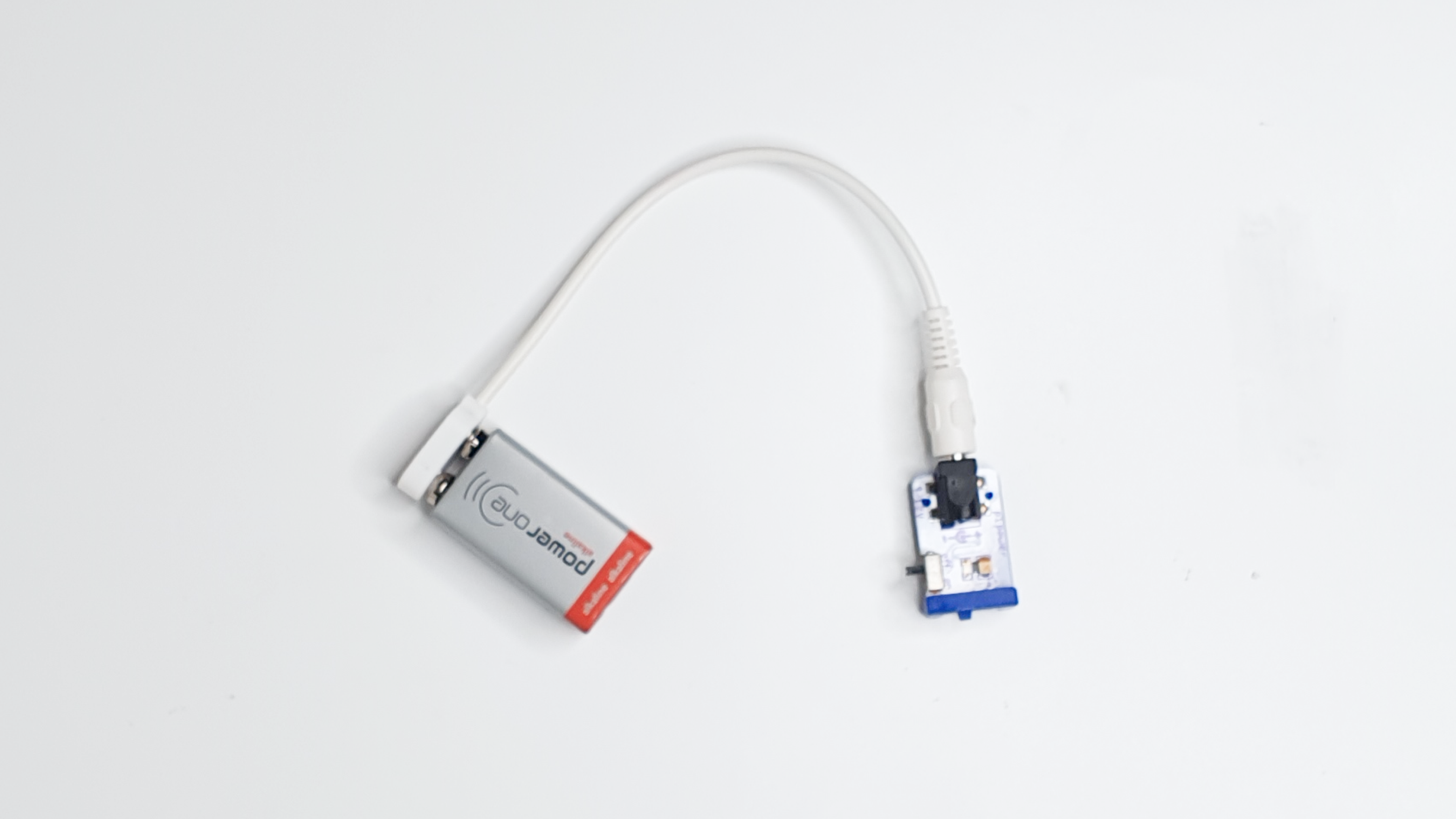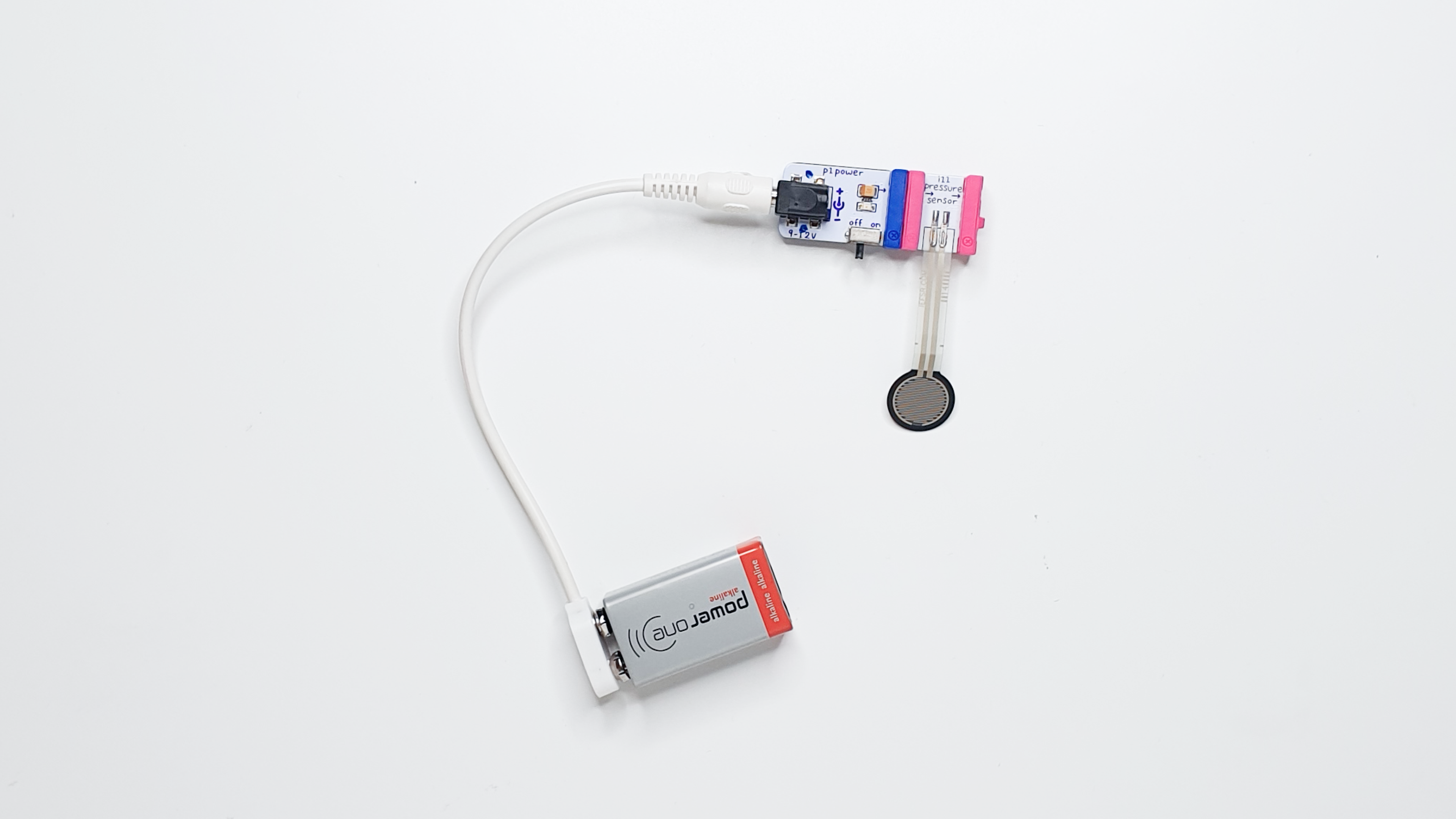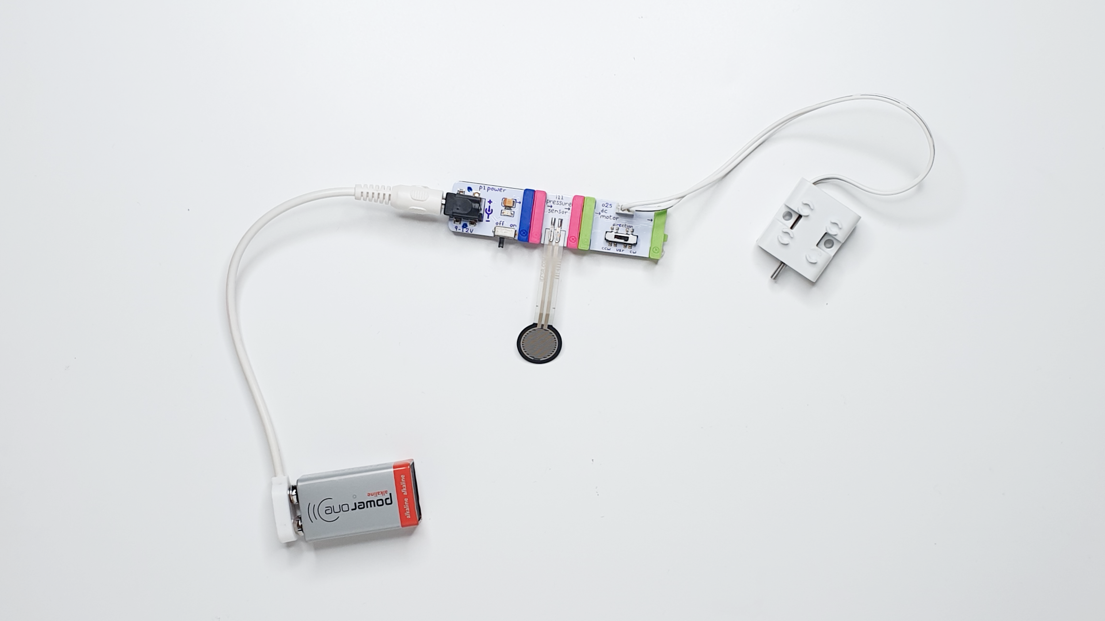 (b) Snap a pressure sensor to power Bit. This pressure sensor responds to how much pressure you put on it. As such, we can use this to vary the amount of signal passing through and eventually control the speed of the DC motor