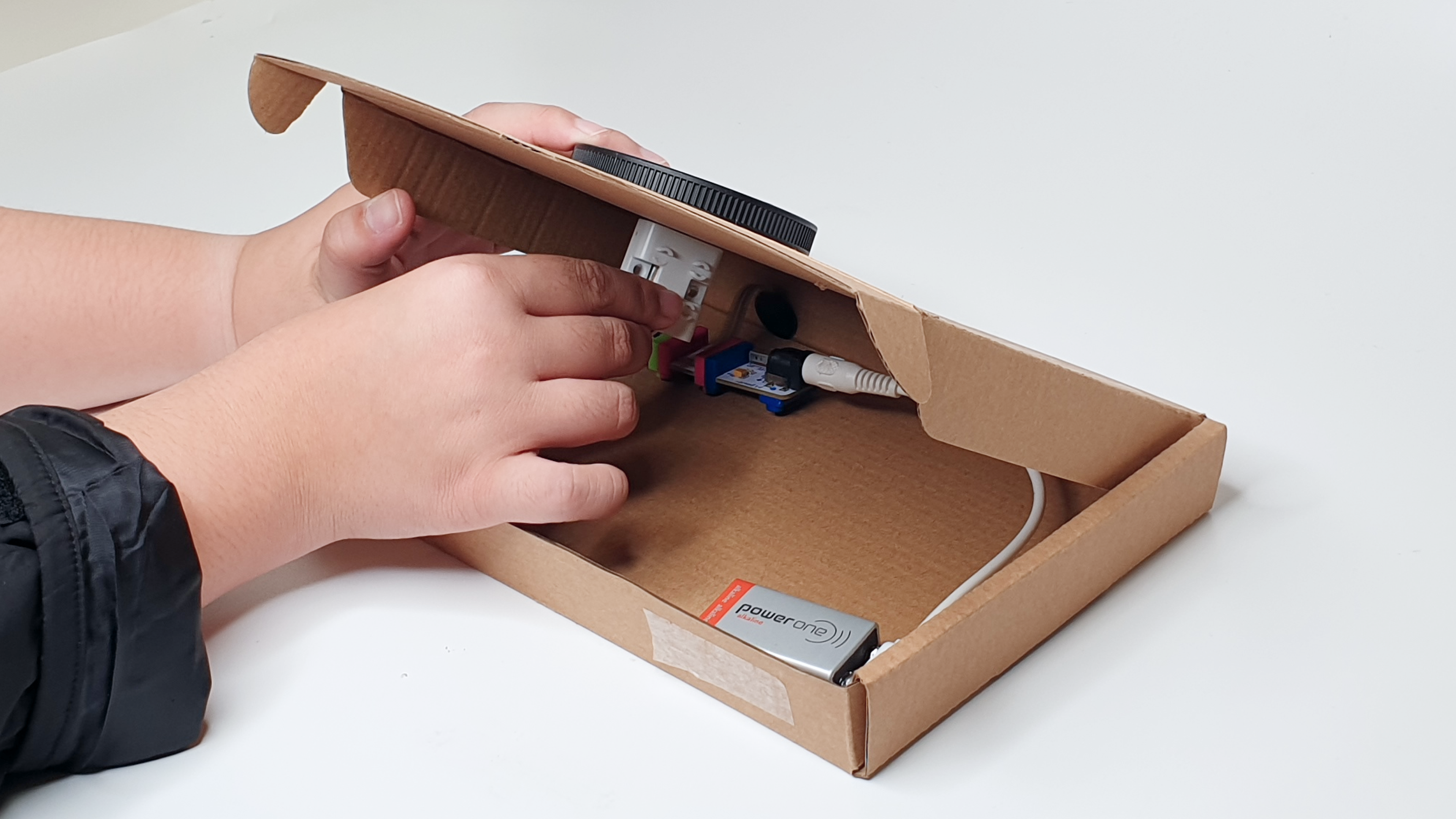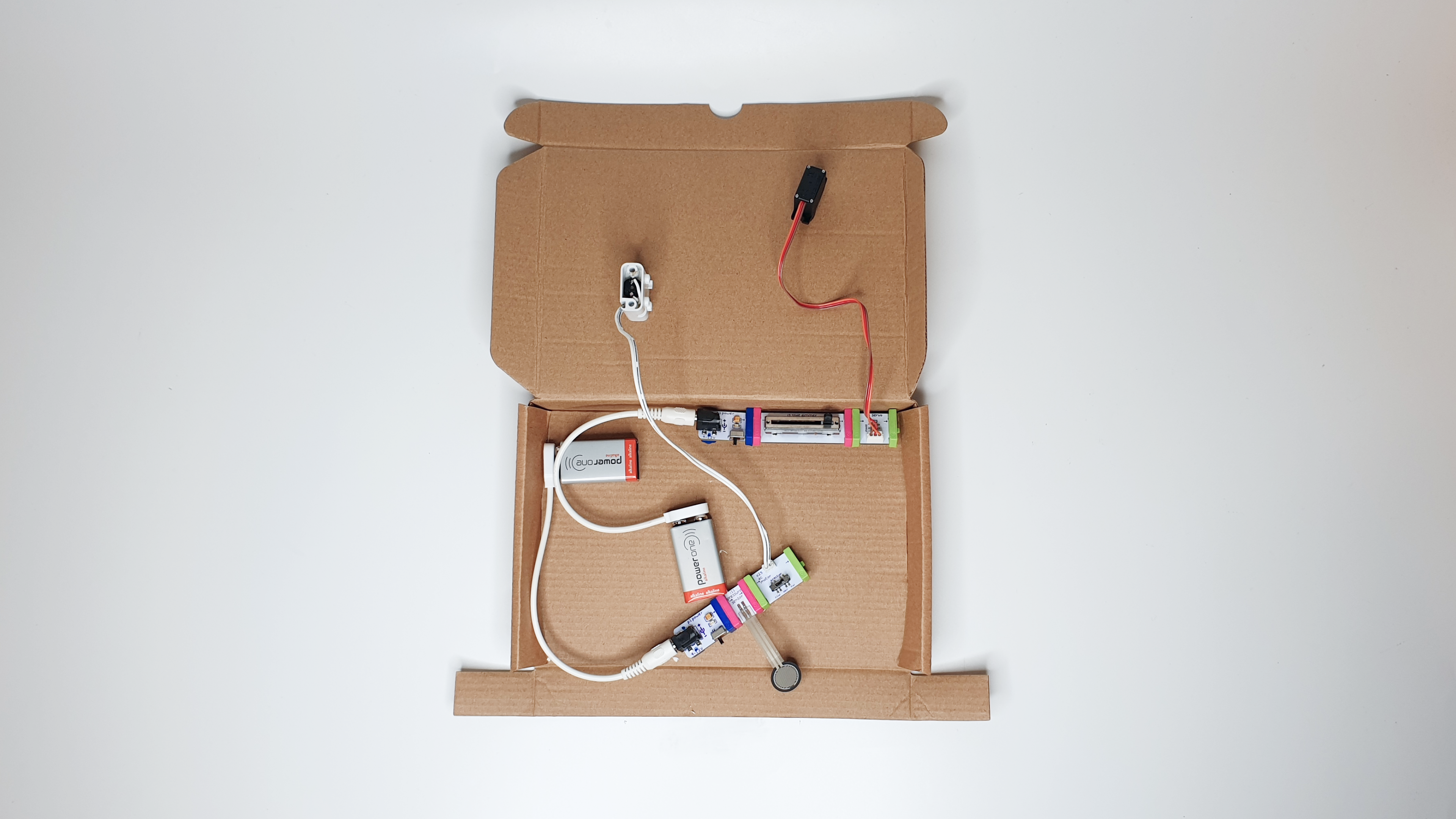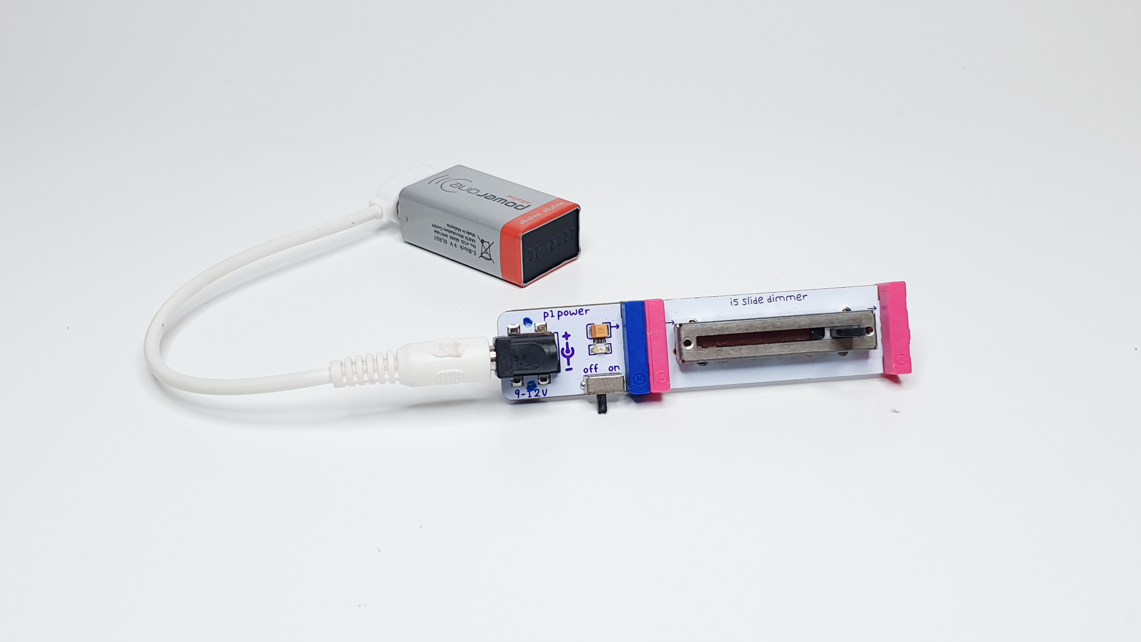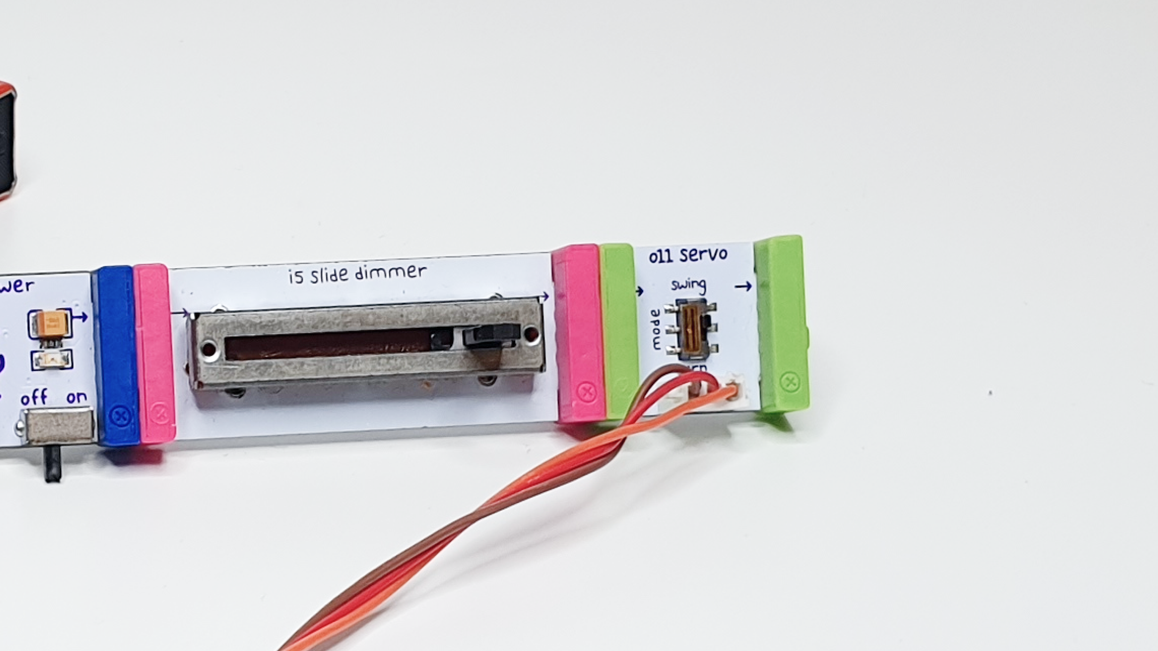 (b) Snap a pressure sensor to power Bit. This pressure sensor responds to how much pressure you put on it. As such, we can use this to vary the amount of signal passing through and eventually control the speed of the DC motor