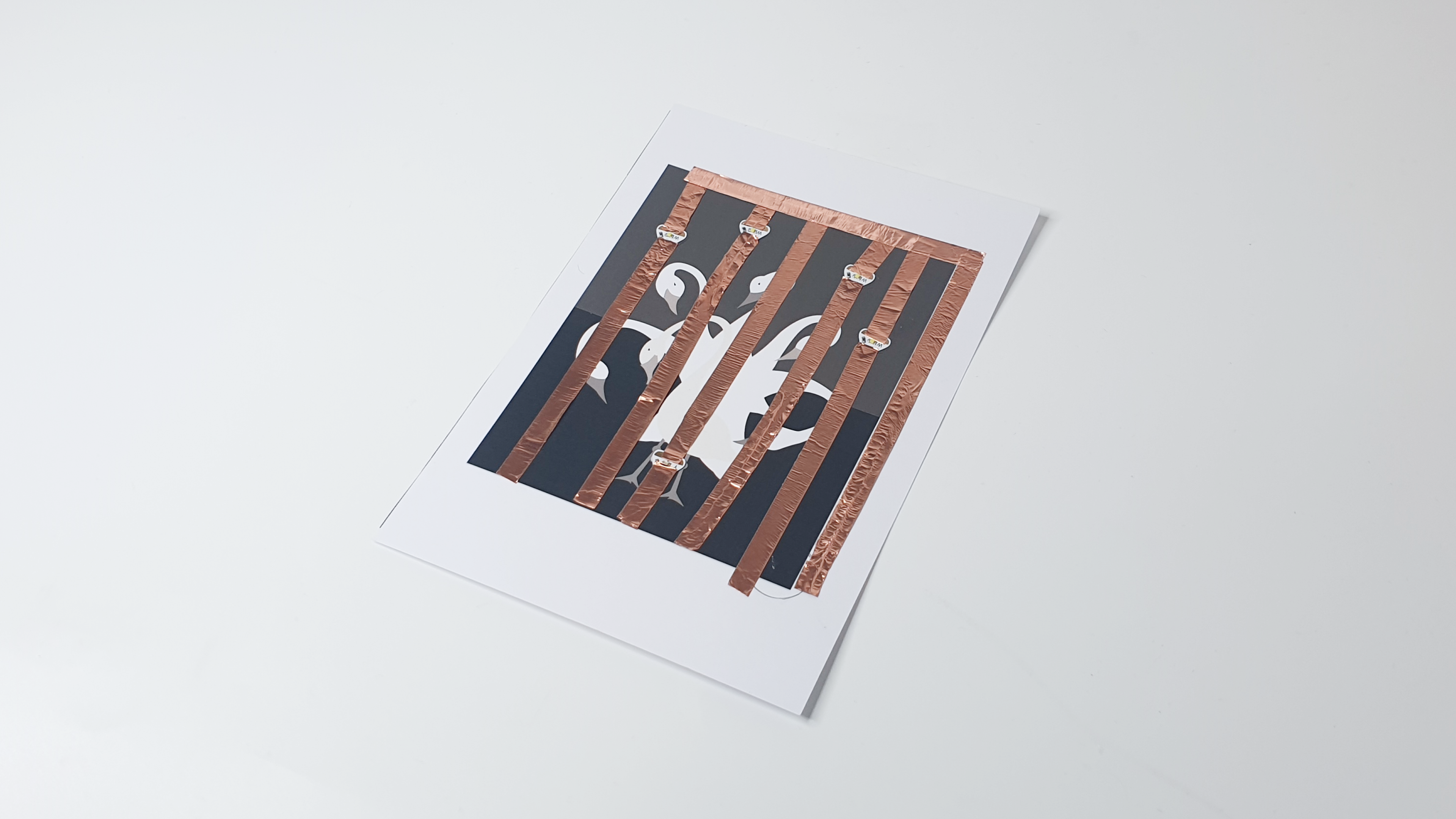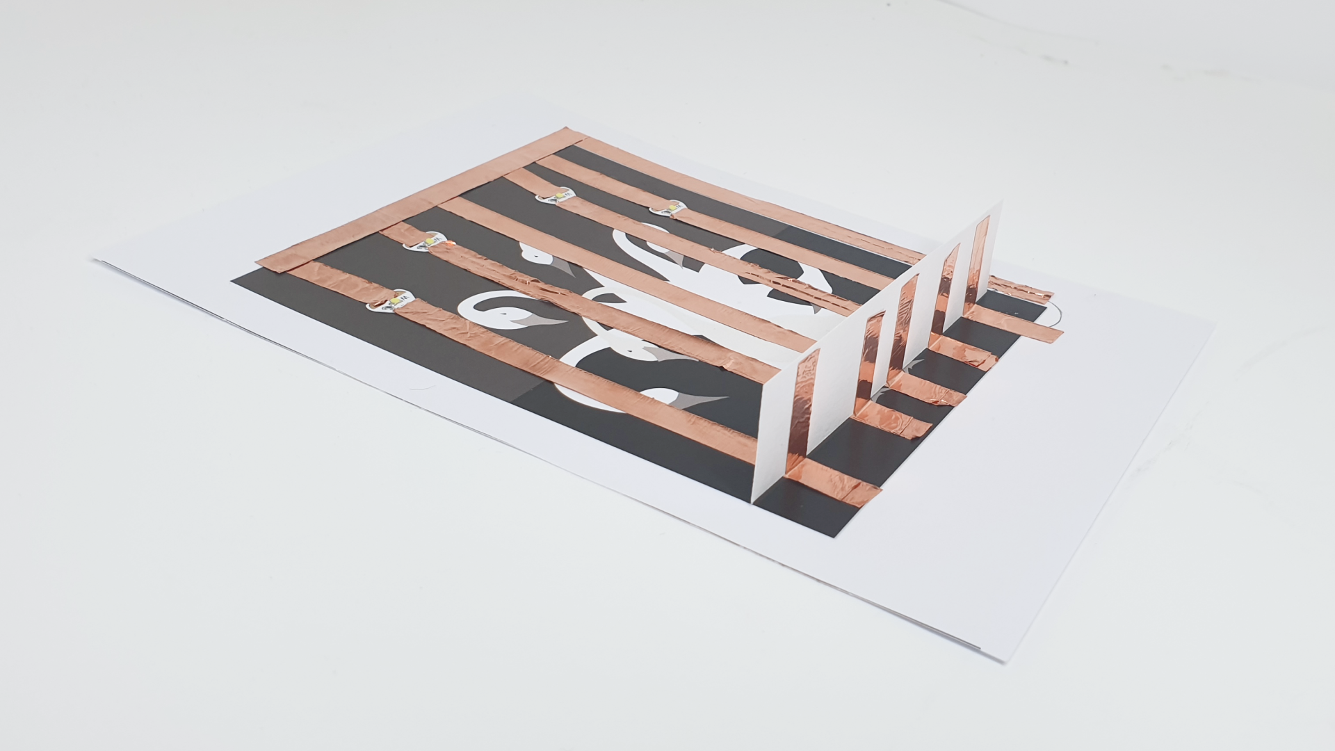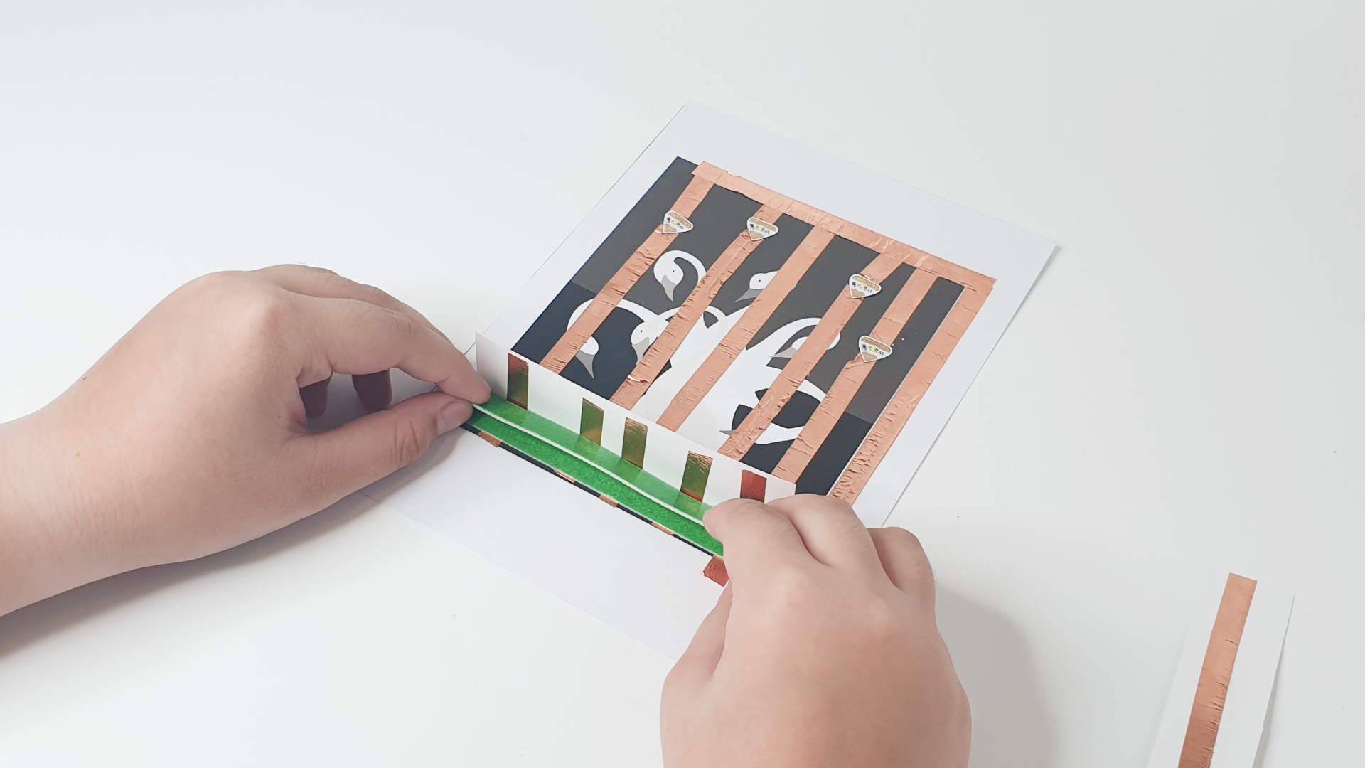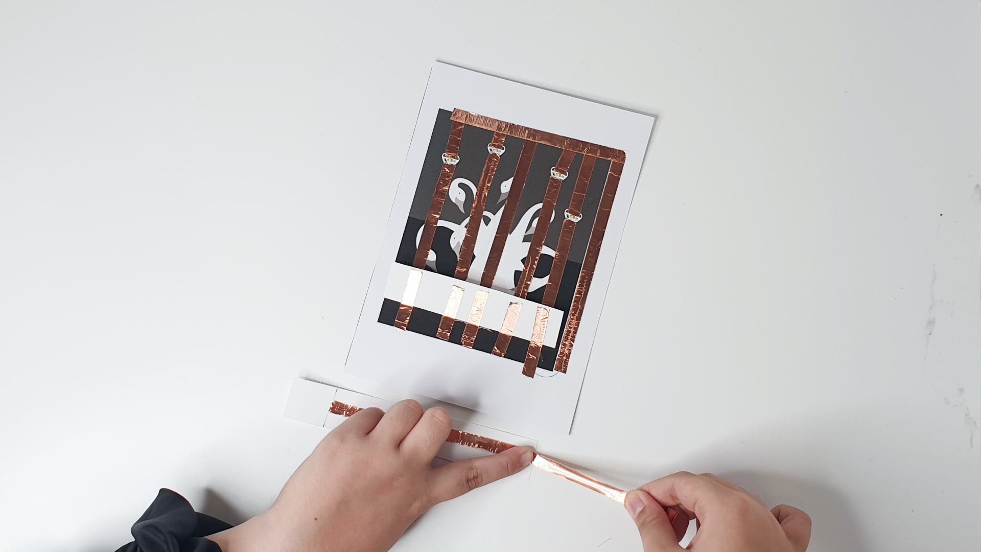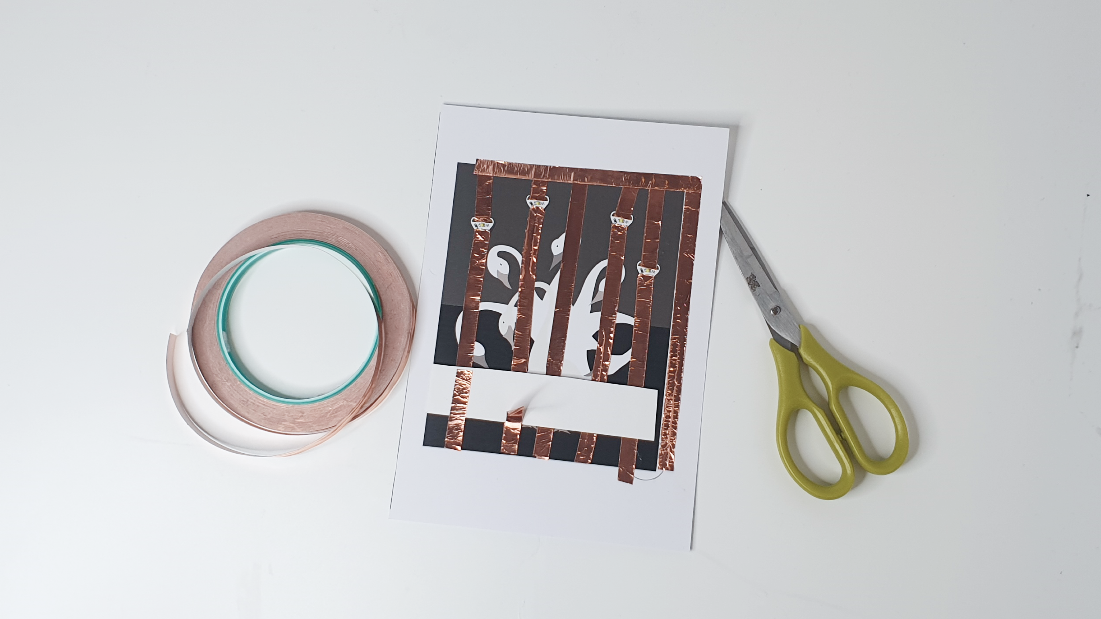 Cut strips of copper tape and stick them onto the card as such. There should be one vertical line for each component. Note that for the LED pieces, we need to use two separate pieces, one for above and one for below.