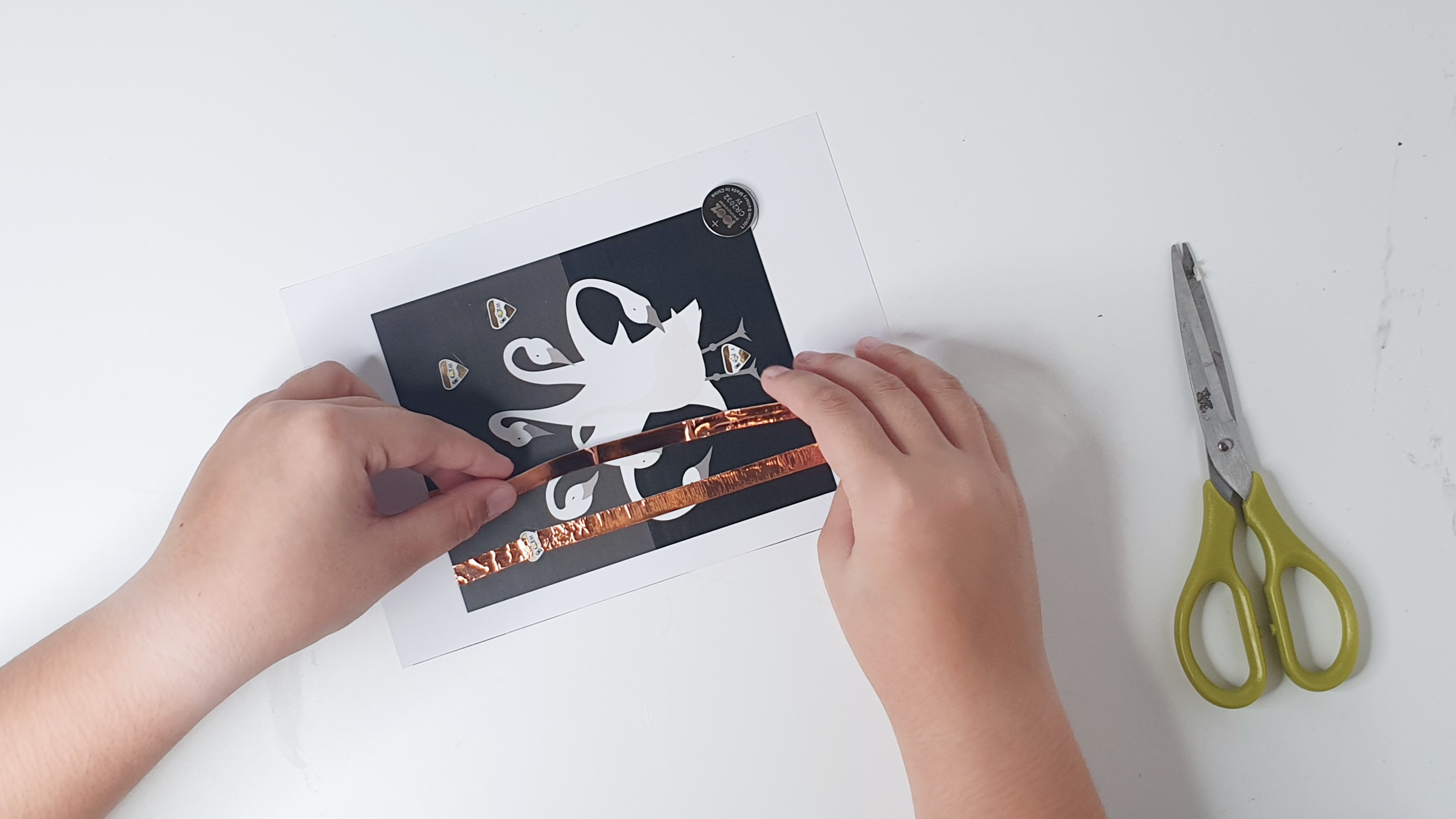 (b) Wrap a long piece of copper tape from one marking to the other side as shown.