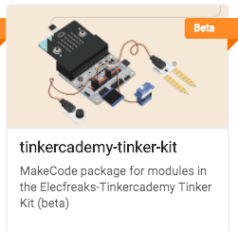 Go to makecode.microbit.org, open up the advanced tab and click on Add Package. Type "tinker kit" into the search box and click on the package shown to add it. You should now see the Tinkercademy and OLED packages.