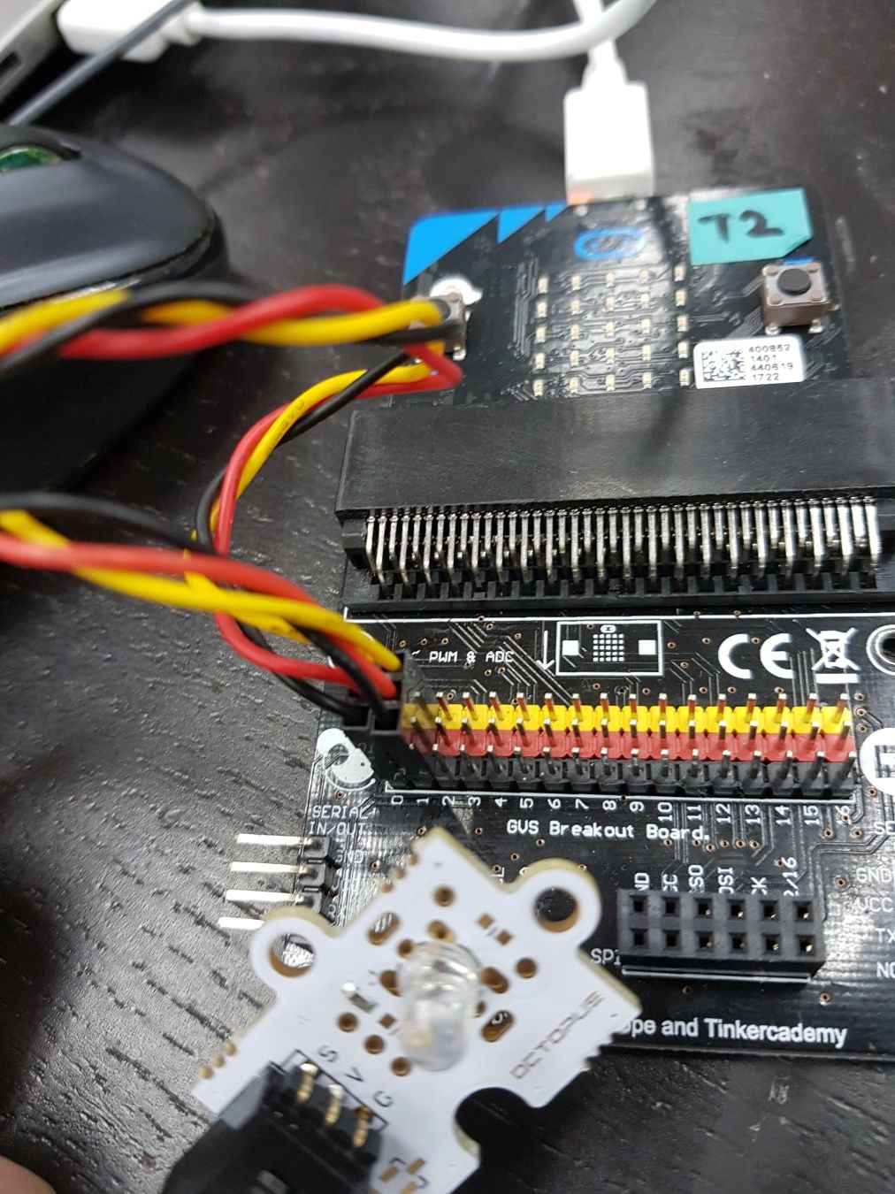 Connect the Micro:bit to the Breakout Board. Then connect the PIR sensor to pin 0 of the Breakout Board and the LED to pin 1 of the Breakout Board, making sure the colours of the wires match the pins on the Breakout Board.