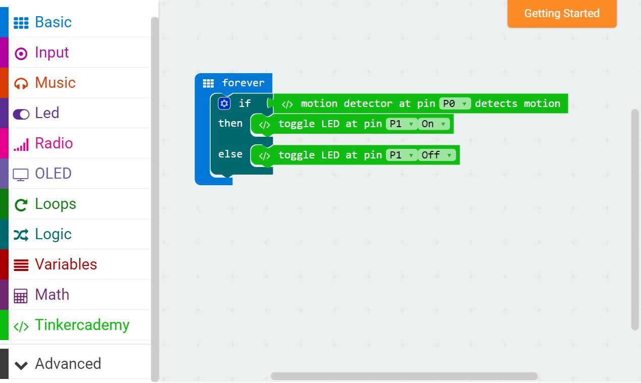 In the forever block, put the following blocks. The 'If' block checks if the PIR sensor detects any movement and if it does, it turns on the LED.
