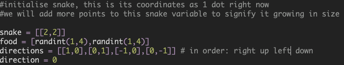 The snake is a list of these points (yes, a list of lists!) as it contains more than one point. It starts as a single pixel at the top left of the screen, denoted by [0,0]. After which, more points will get appended to the list.