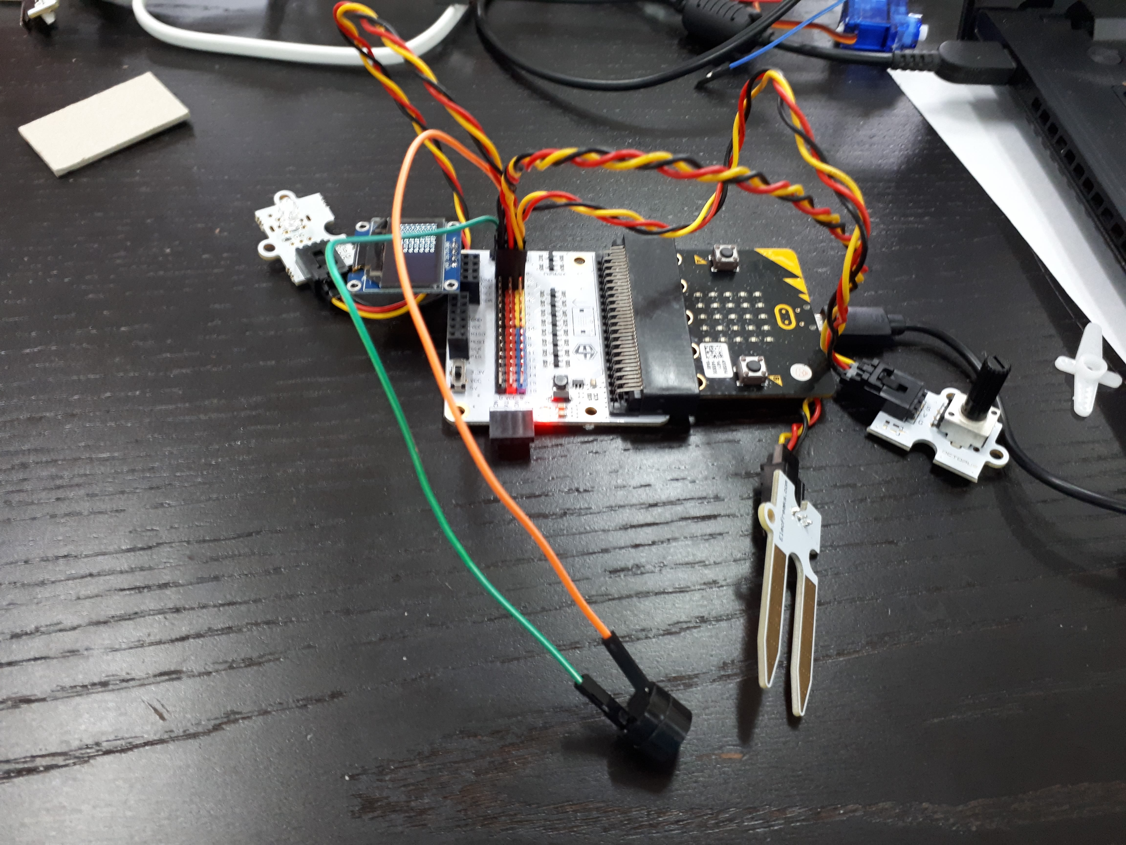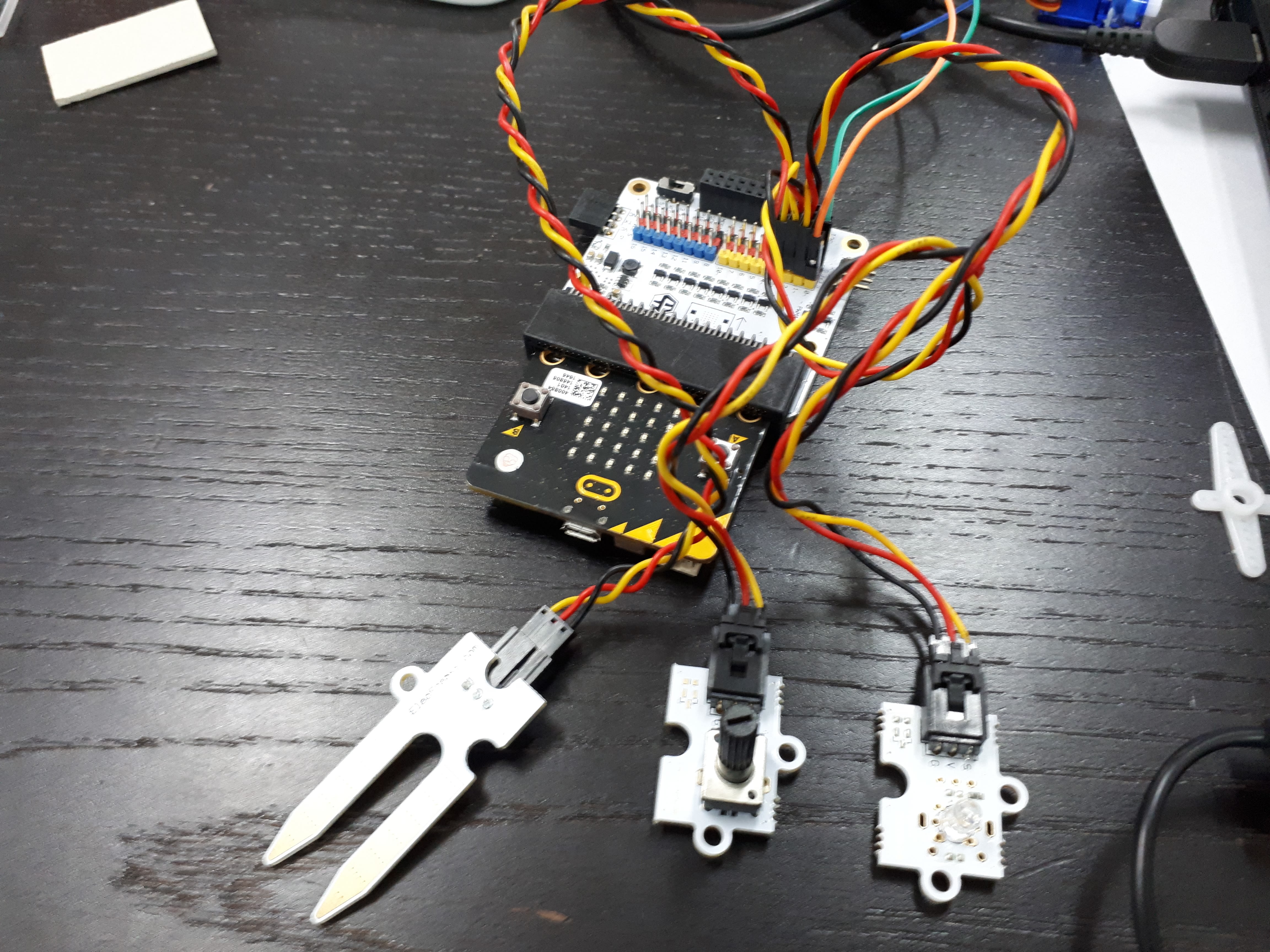Connect the light bulb to P1, the potentiometer to P2 and the soil moisture sensor to P3