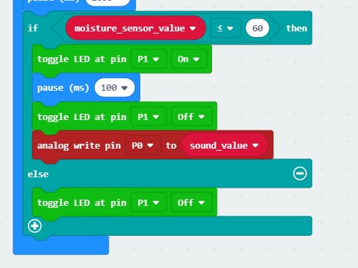 You may upload the code to your micro:bit, if the steps are done correctly, when the moisture sensor value goes below 60% are your desired value, the LED blinks and the buzzer makes a sound. Turning the potentiometer will control the volume of the sound created