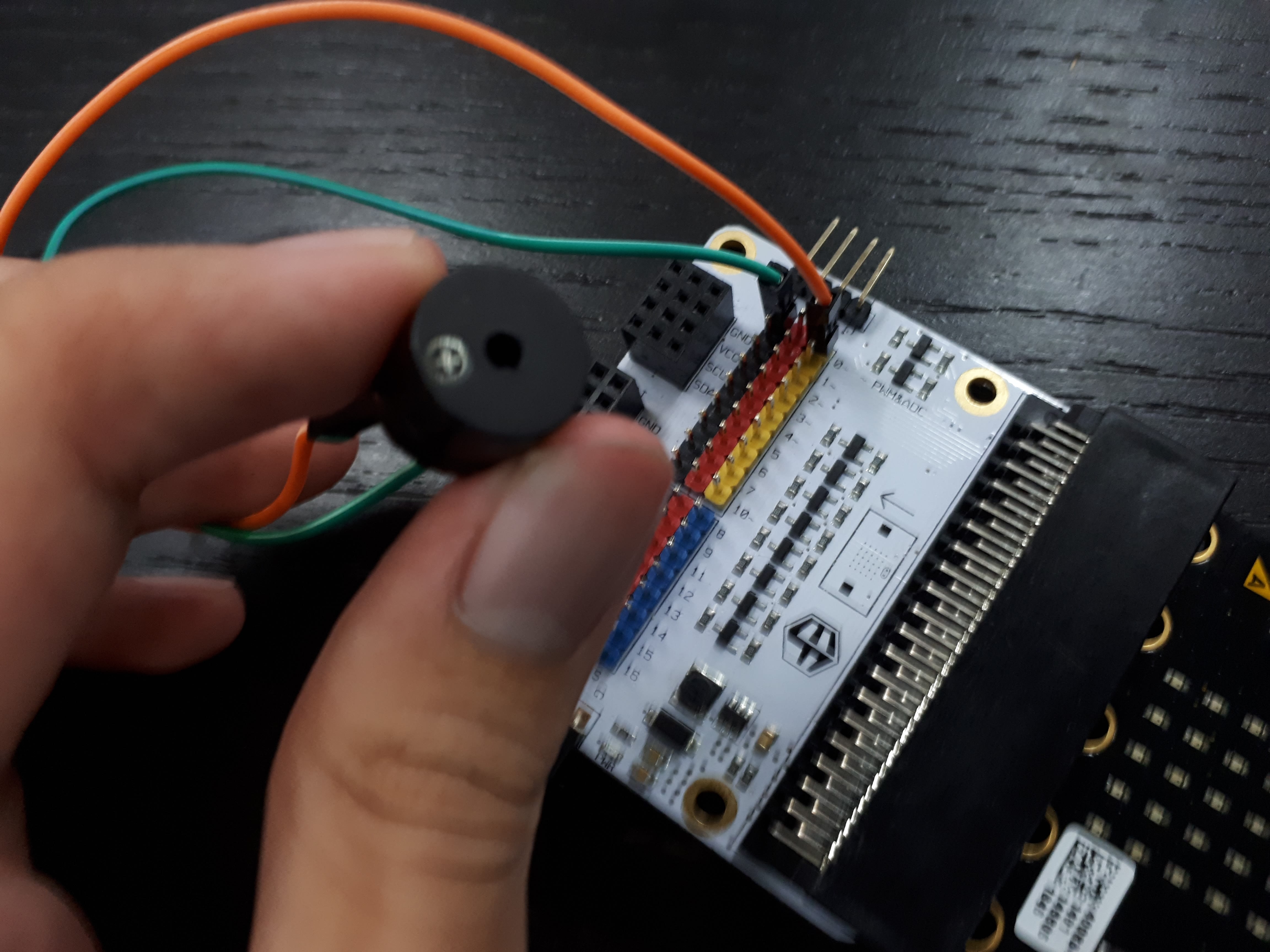 The positive leg of the buzzer (in this example, the orange jumper wire) goes to the yellow pin.