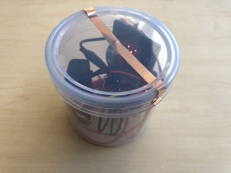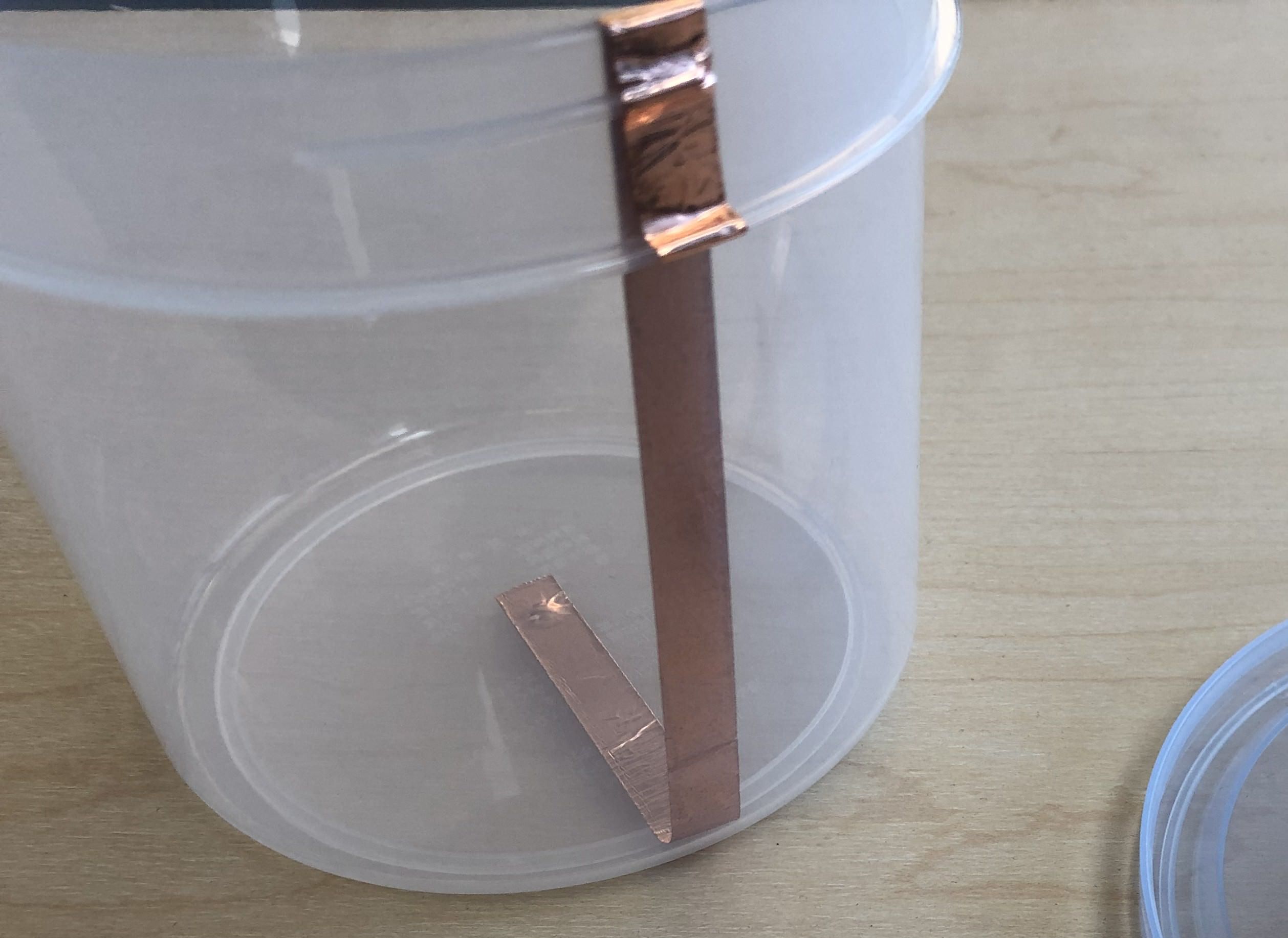We want our buzzer to make noise whenever someone opens the container. To accomplish this, we use copper tape to turn the lid into a giant reverse button of sorts, which will be “on” when the lid is closed, and “off” when the lid is open.