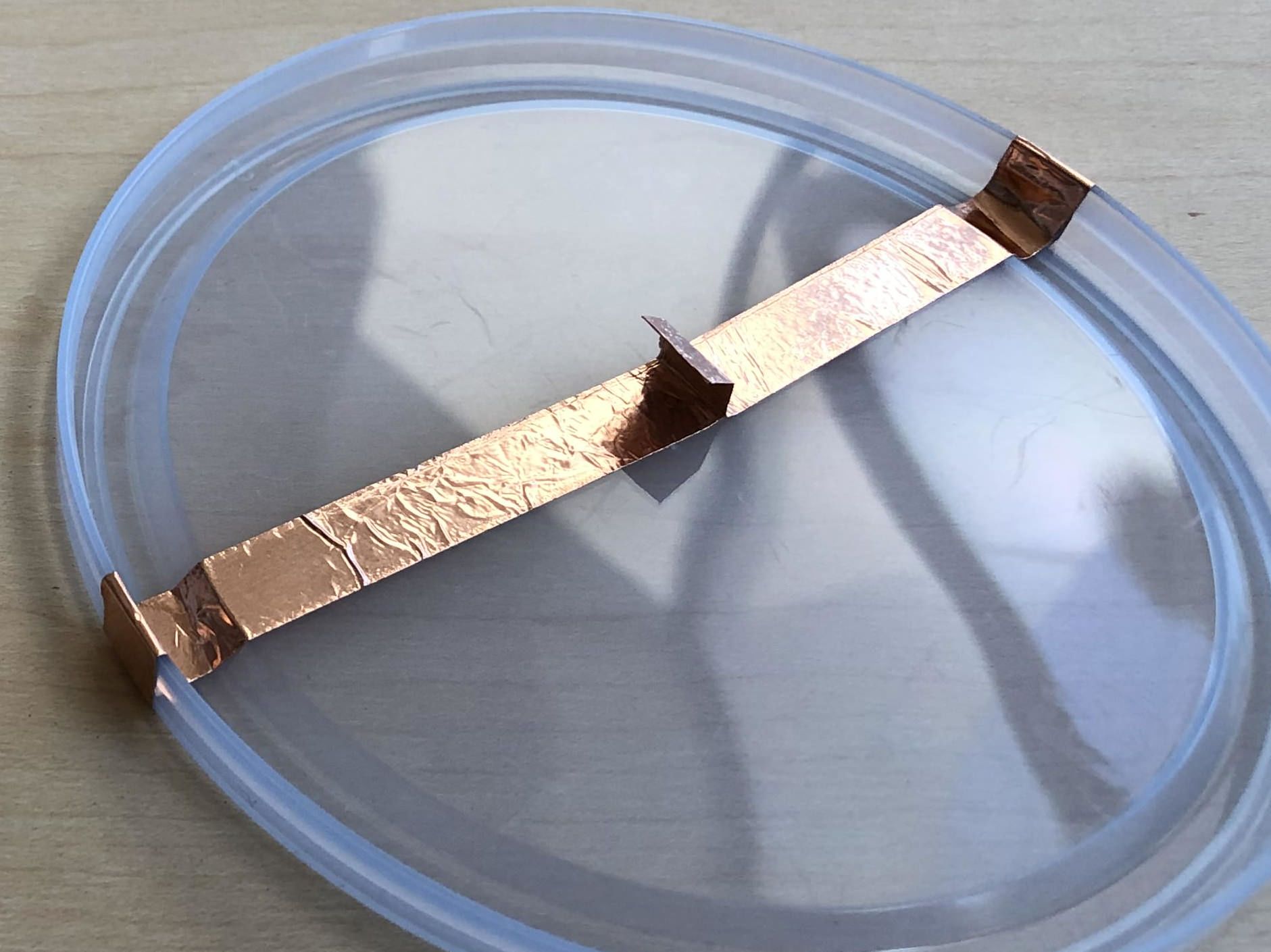 To begin, attach a strip of copper tape to the lid, overhanging the edge.