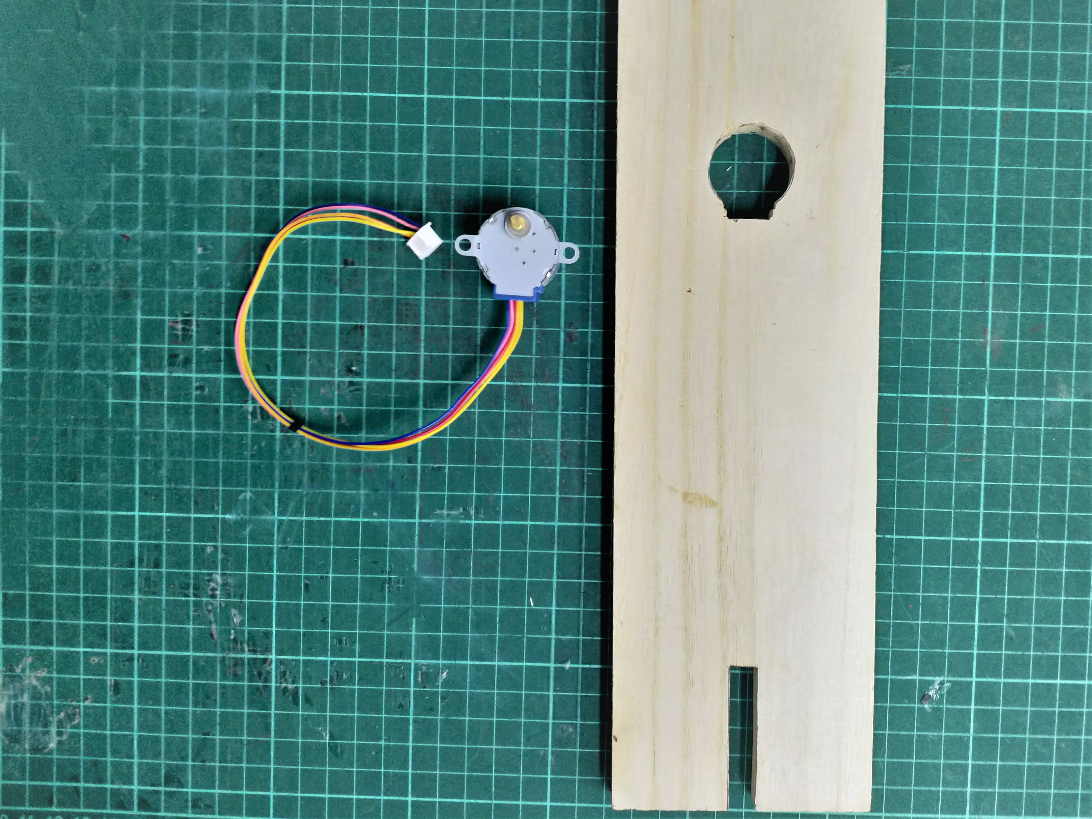 Trace and bore out a stepper motor shaped hole in your stand. The stepper motor should fit snugly and not move when it is pushed into this hole. Make it a little more snug than a glove.