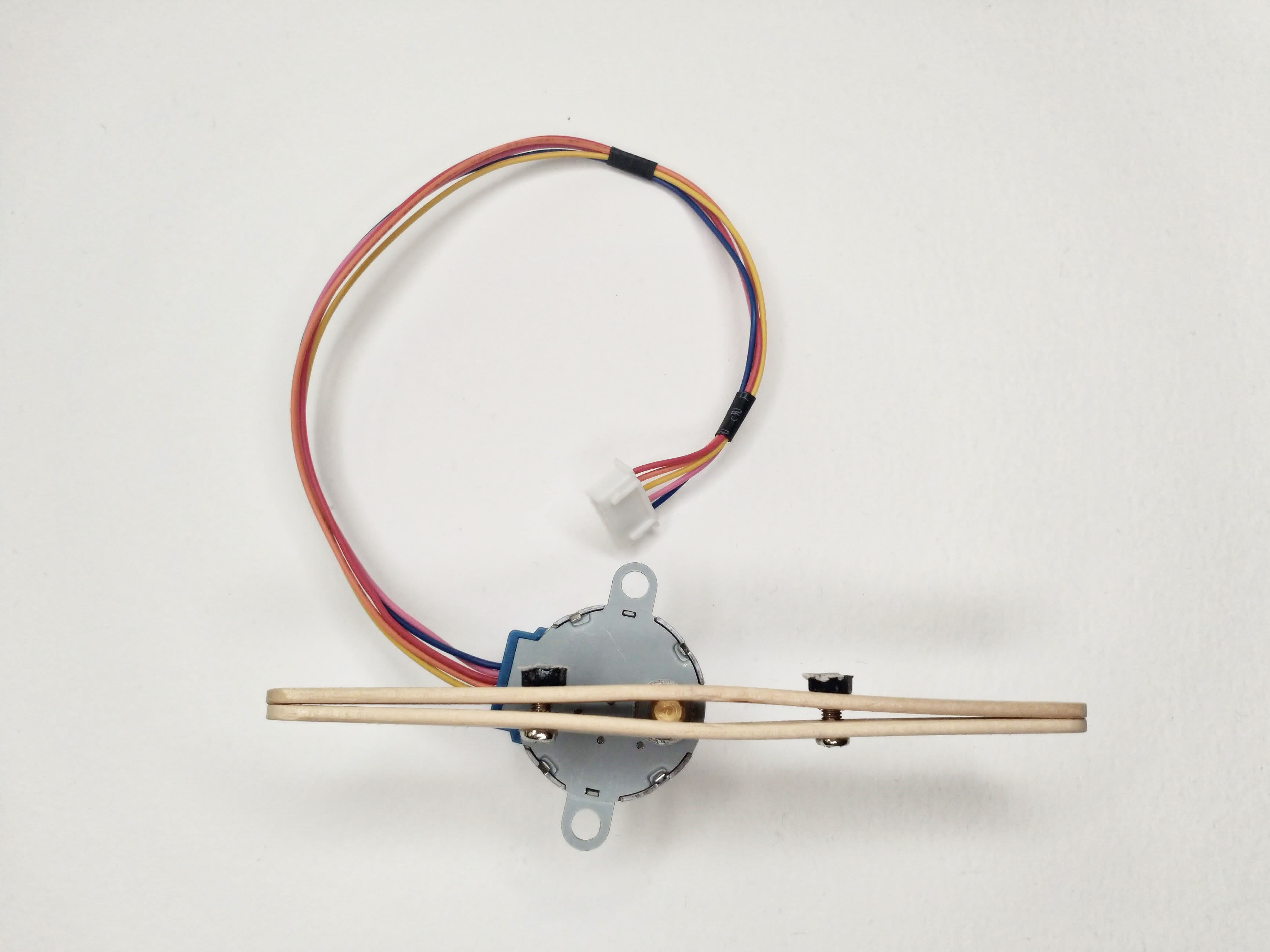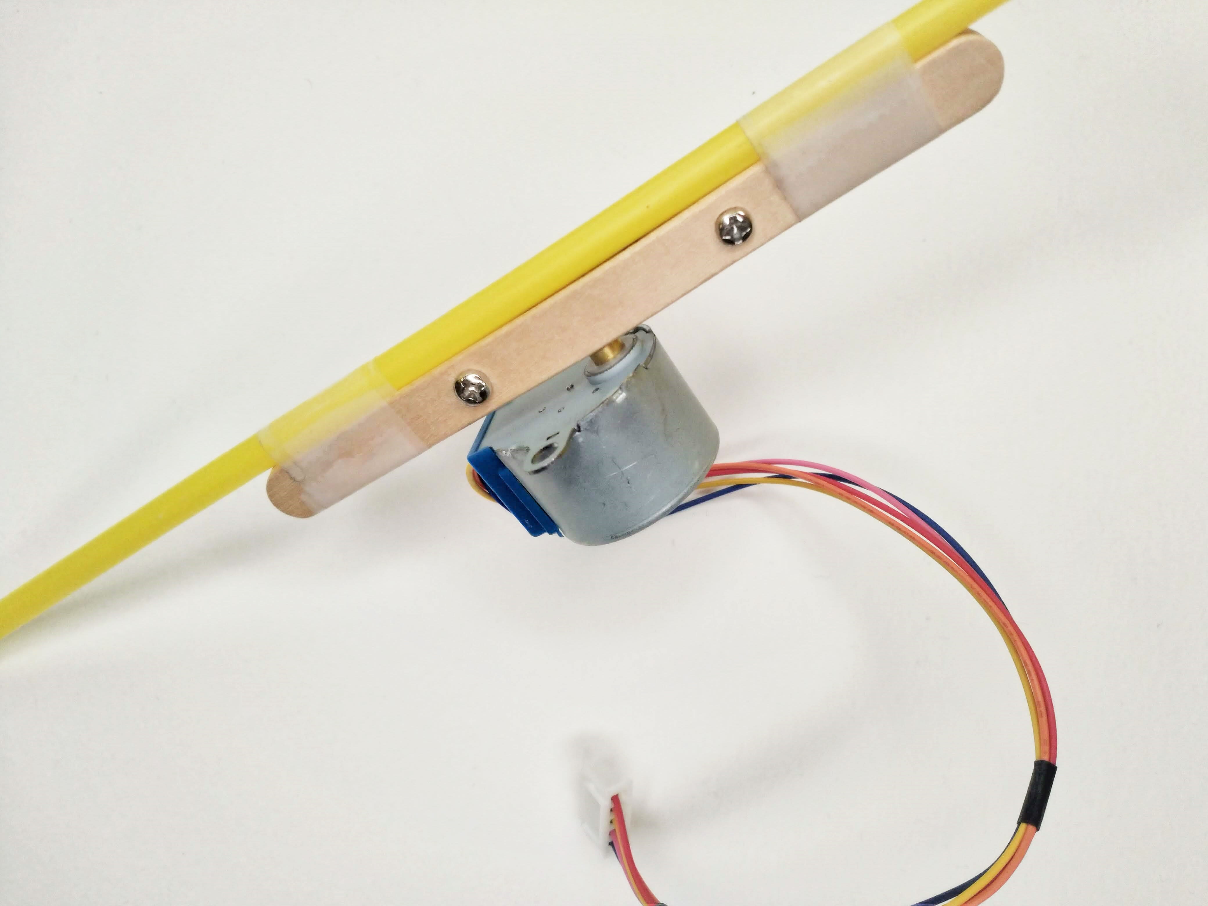 Bore appropriately-sized holes into the ice cream sticks, then extend the stepper motor’s shaft with two ice cream sticks screwed tightly together to sandwich the shaft.