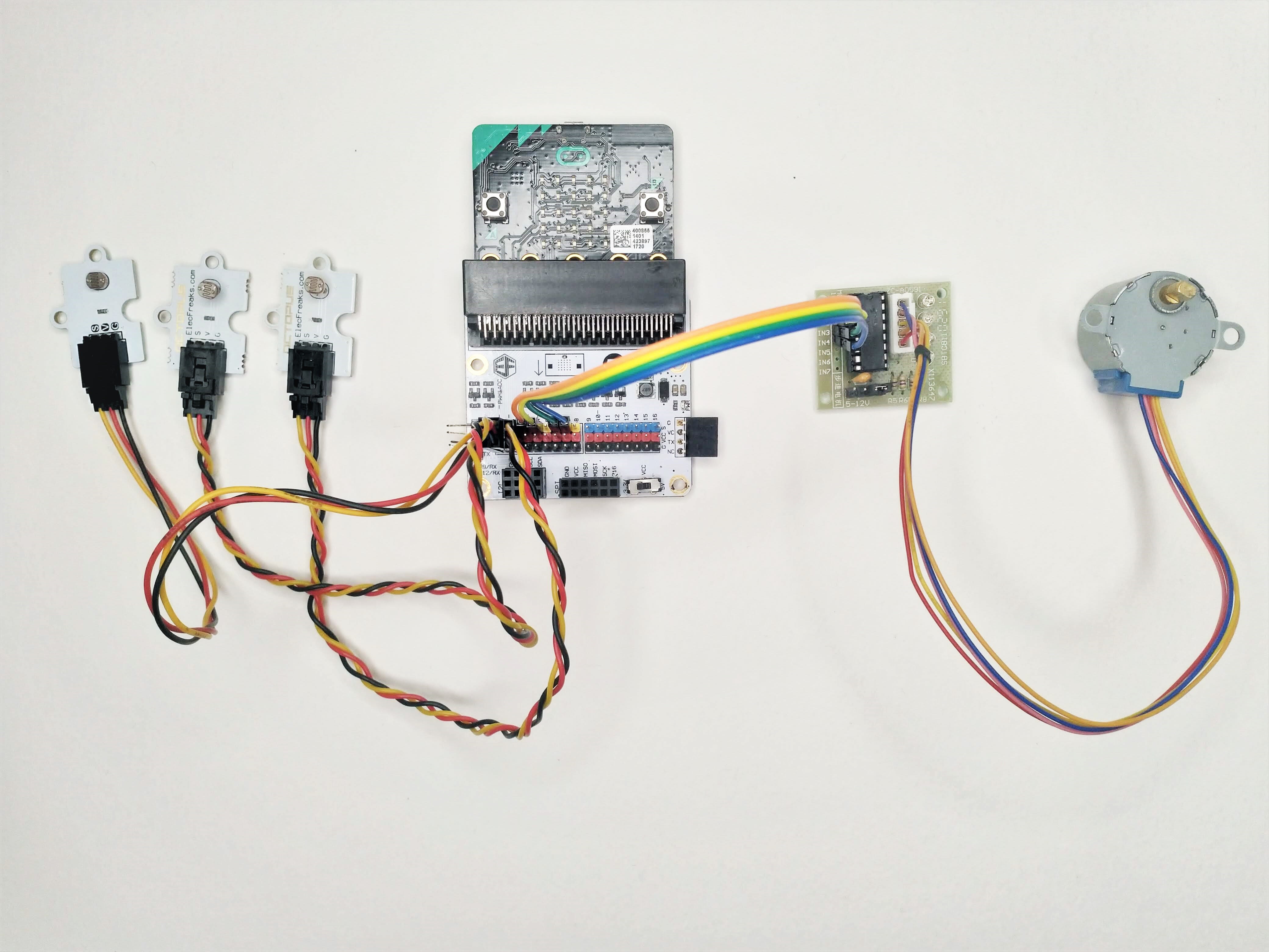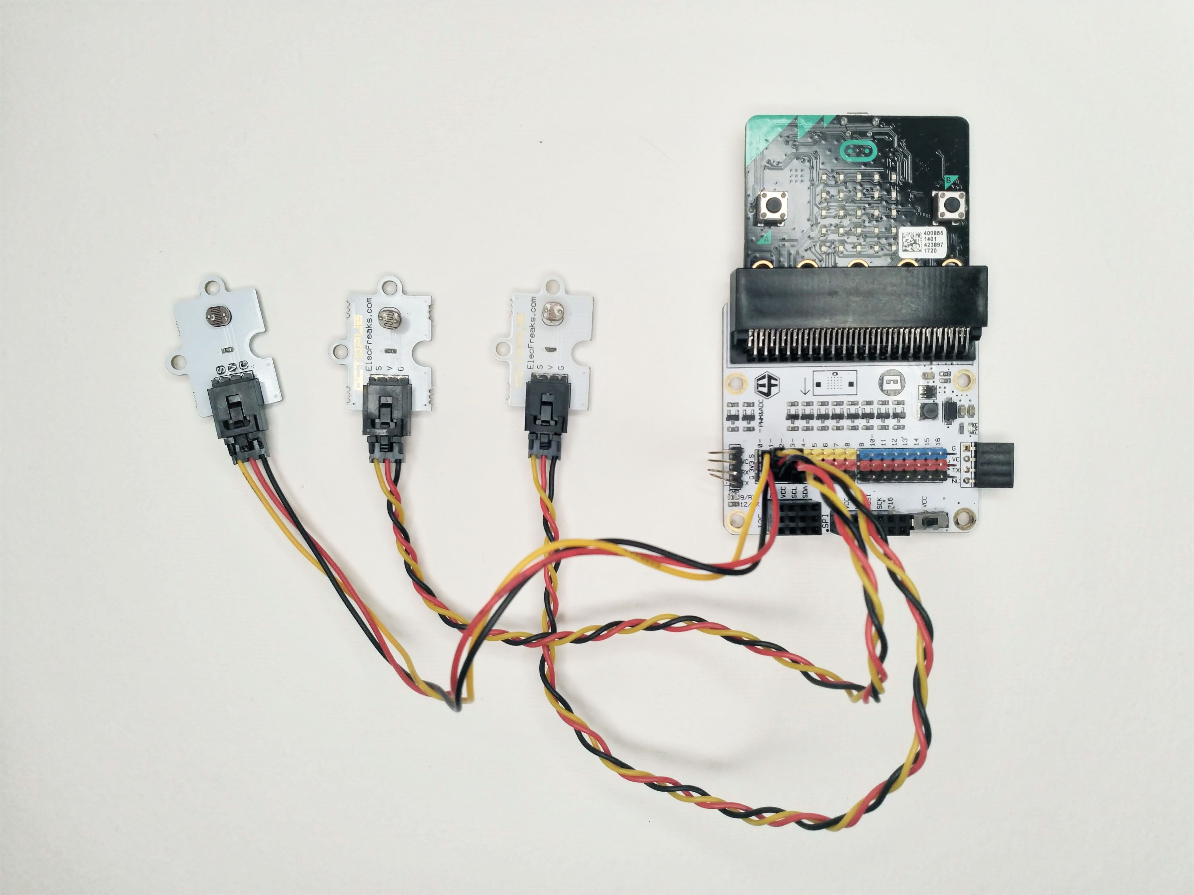 We begin by slotting our micro:bit into the breakout board, and connecting the light sensors to P0, P1, and P2.