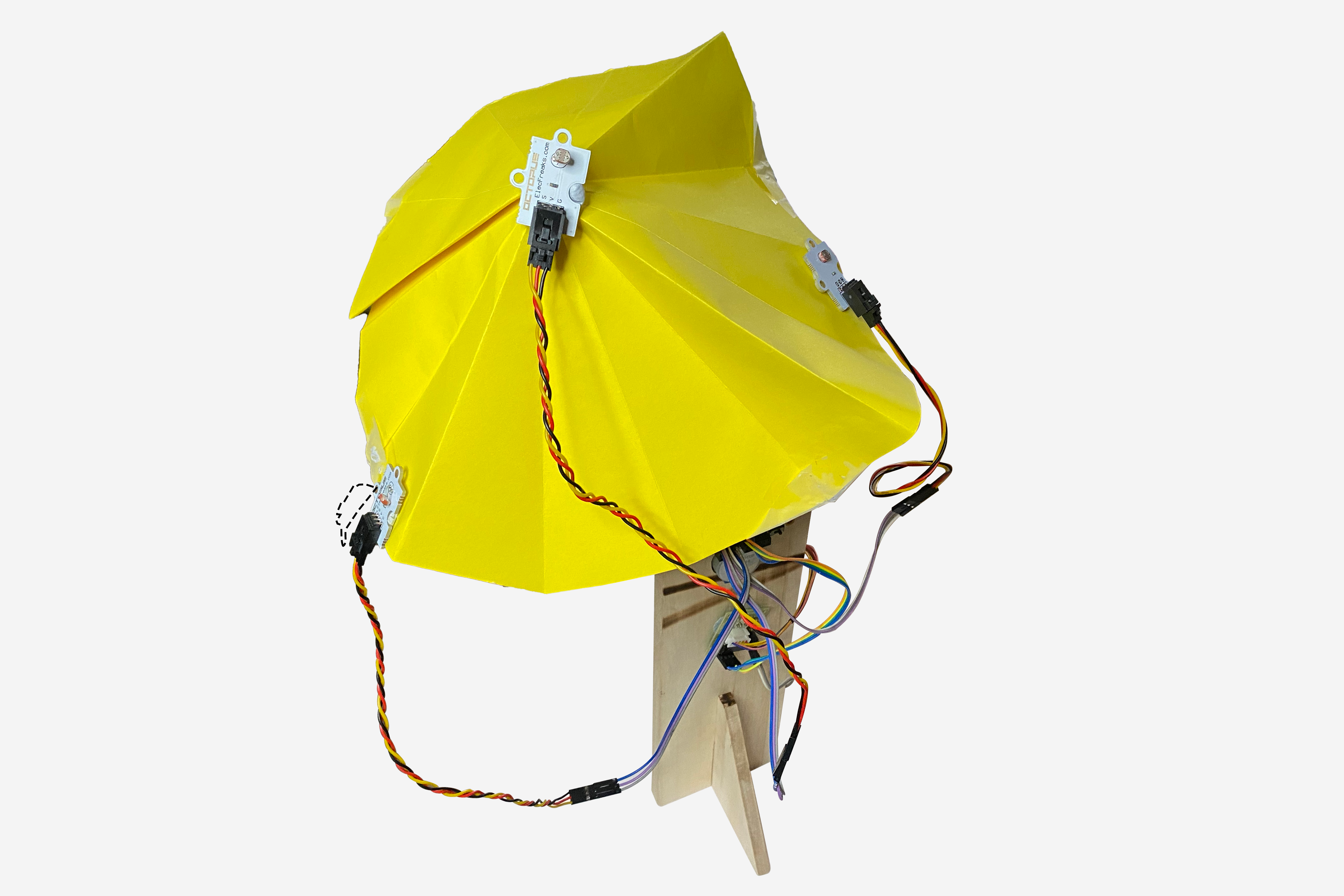 Attach the light sensors to the umbrella. With 3 light sensors, we can put them along a row to track the sun’s movement from east to west. Attach them such that two are along the edges of the umbrella, and one is right at the top.