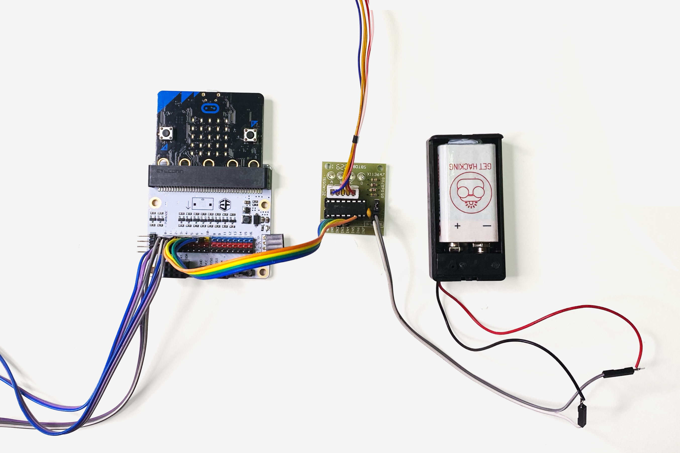 Attach the micro:bit and motor driver to the stand, connect all the components, and extend the components with jumper wires if needed.