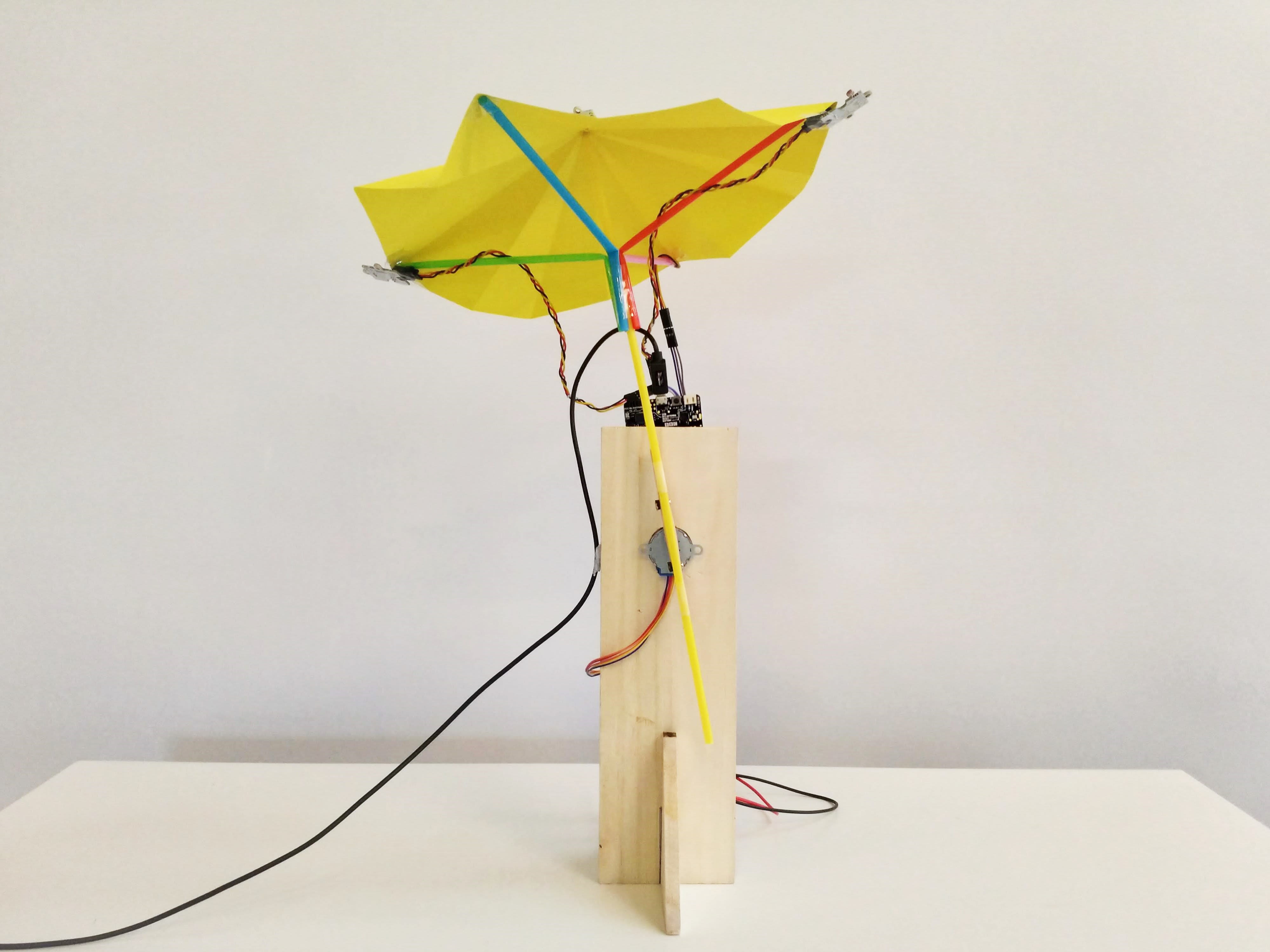 Push and secure the stepper motor into the snug hole in the stand. The light sensors should face the sides of the stand, so the rotation of the umbrella follows the line created by the 3 light sensors.