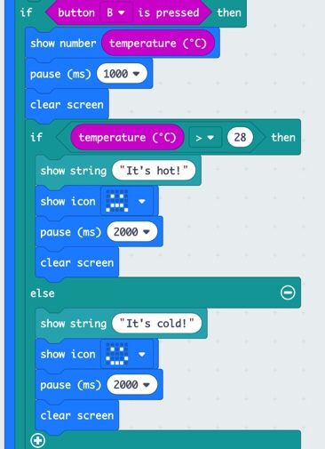 This part is for the temperature. If it is less than or equal to 28, it will say ‘It’s cold’ and shows a happy face. If it is more than 28 it will say ‘It’s hot’ and shows a sad face.