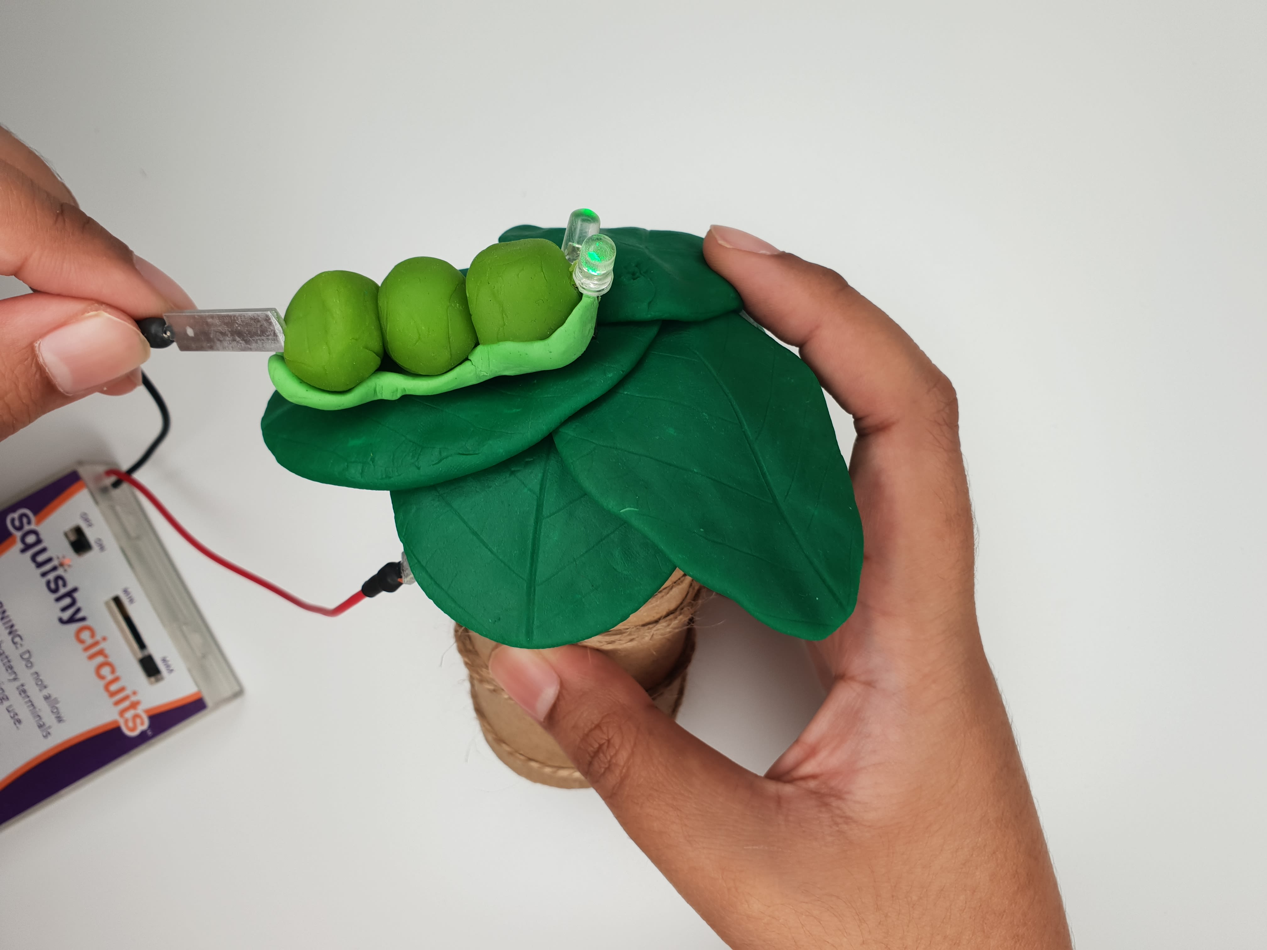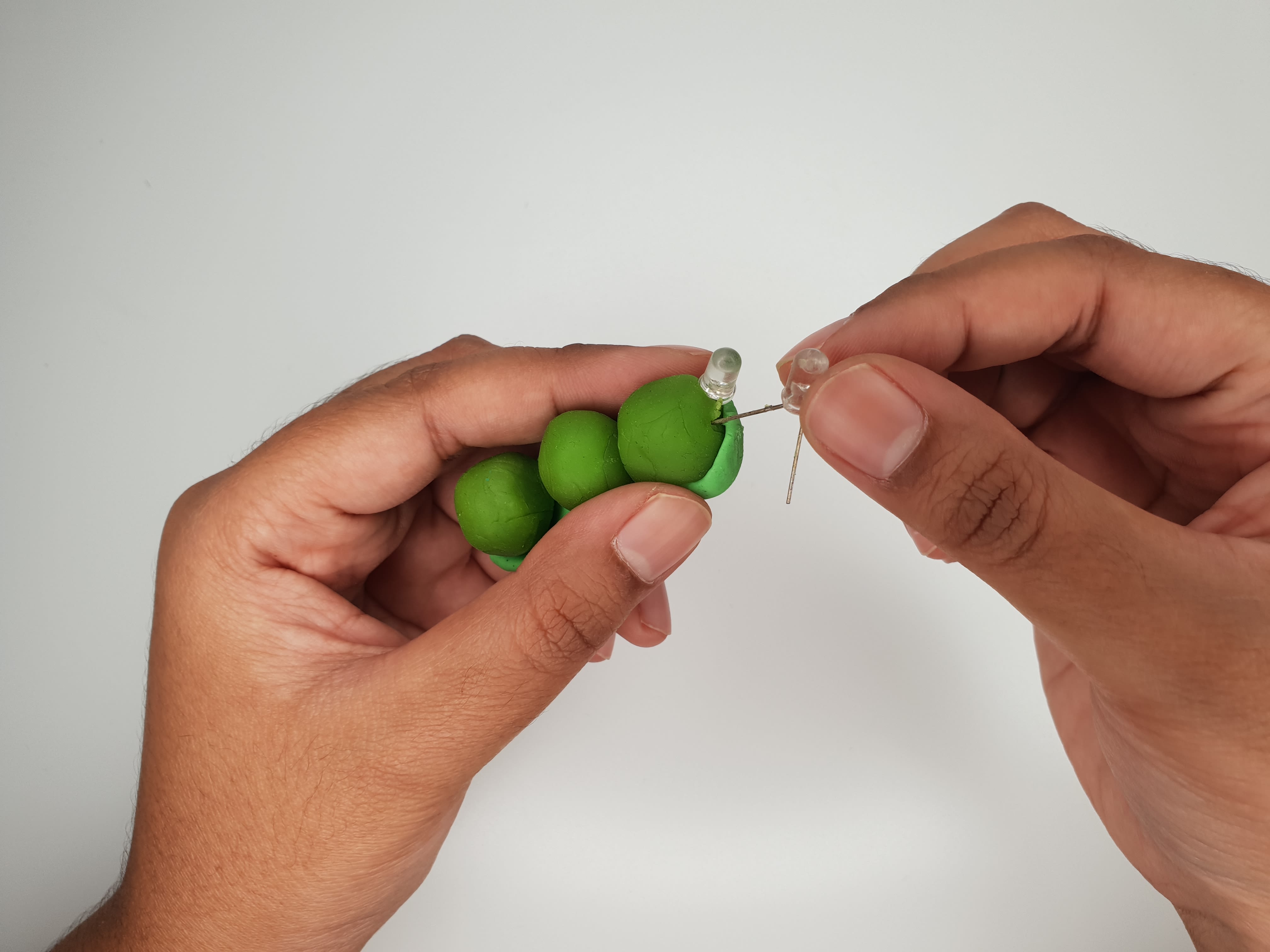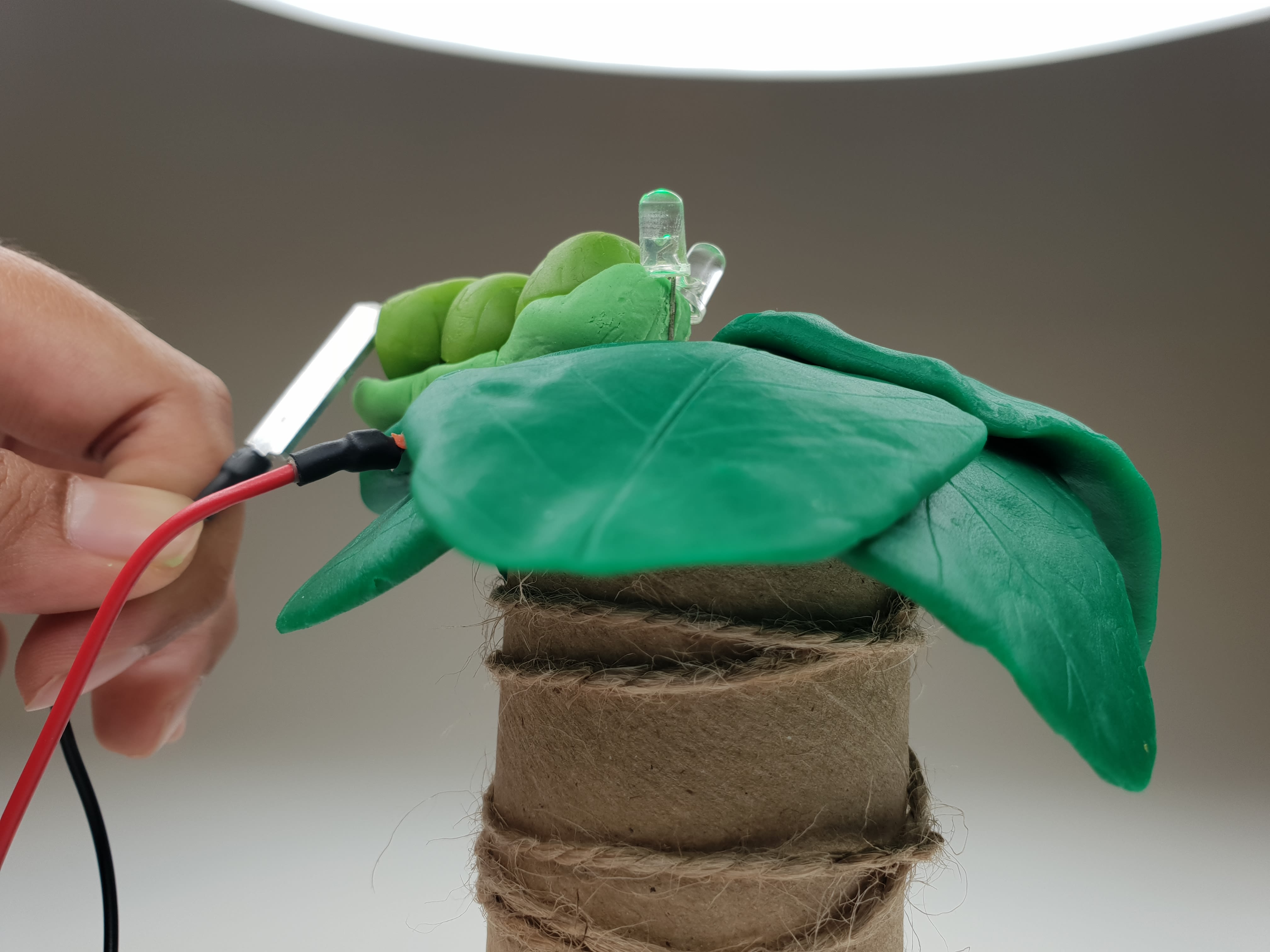We're gonna complete the circuit now! Simply poke the exposed LED pins into the leaves