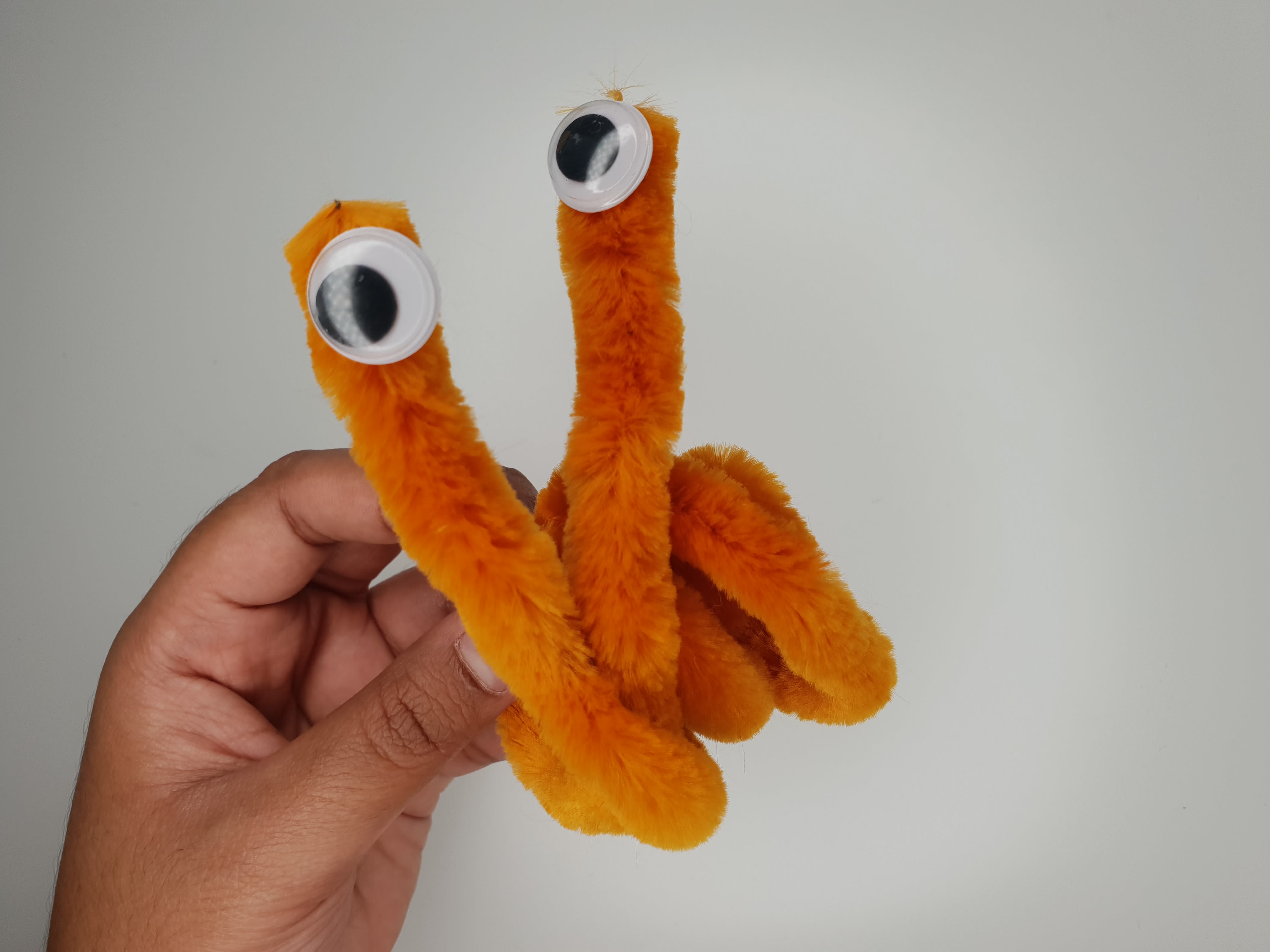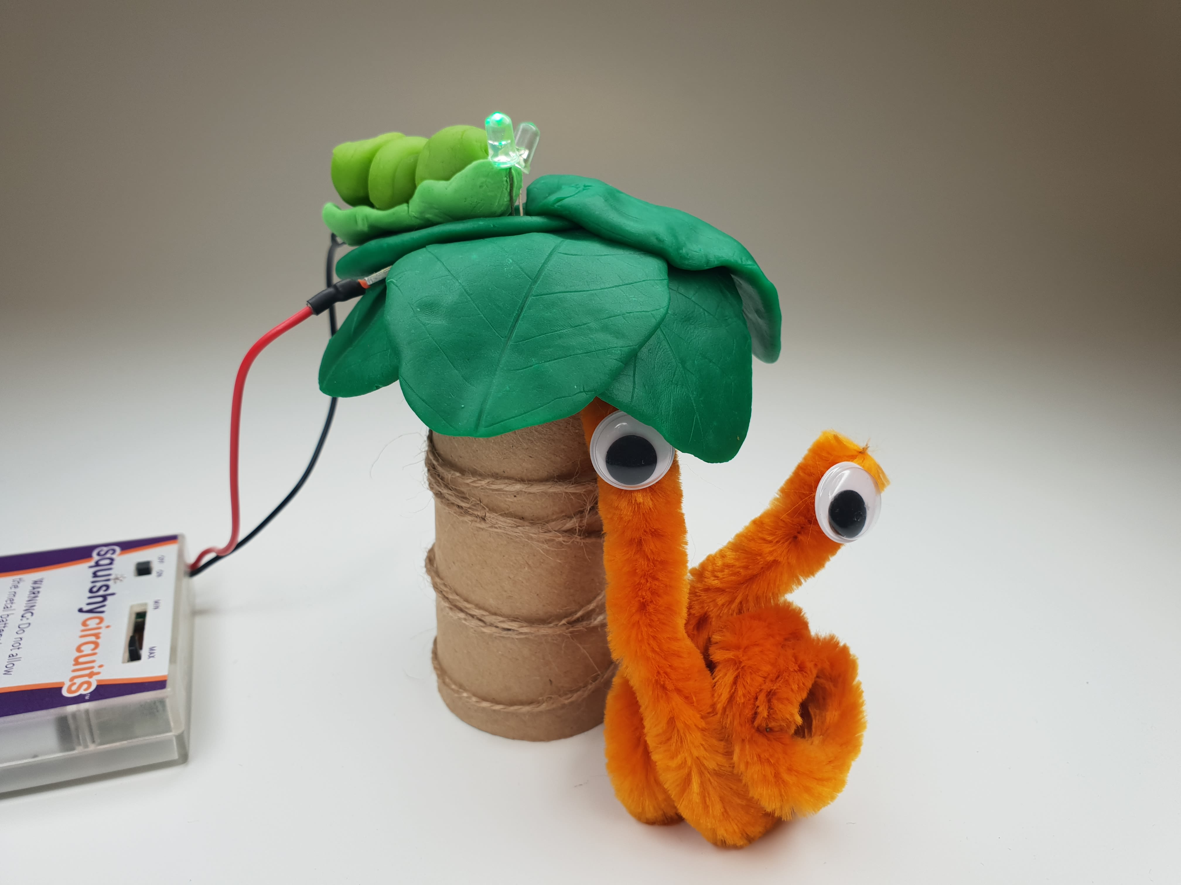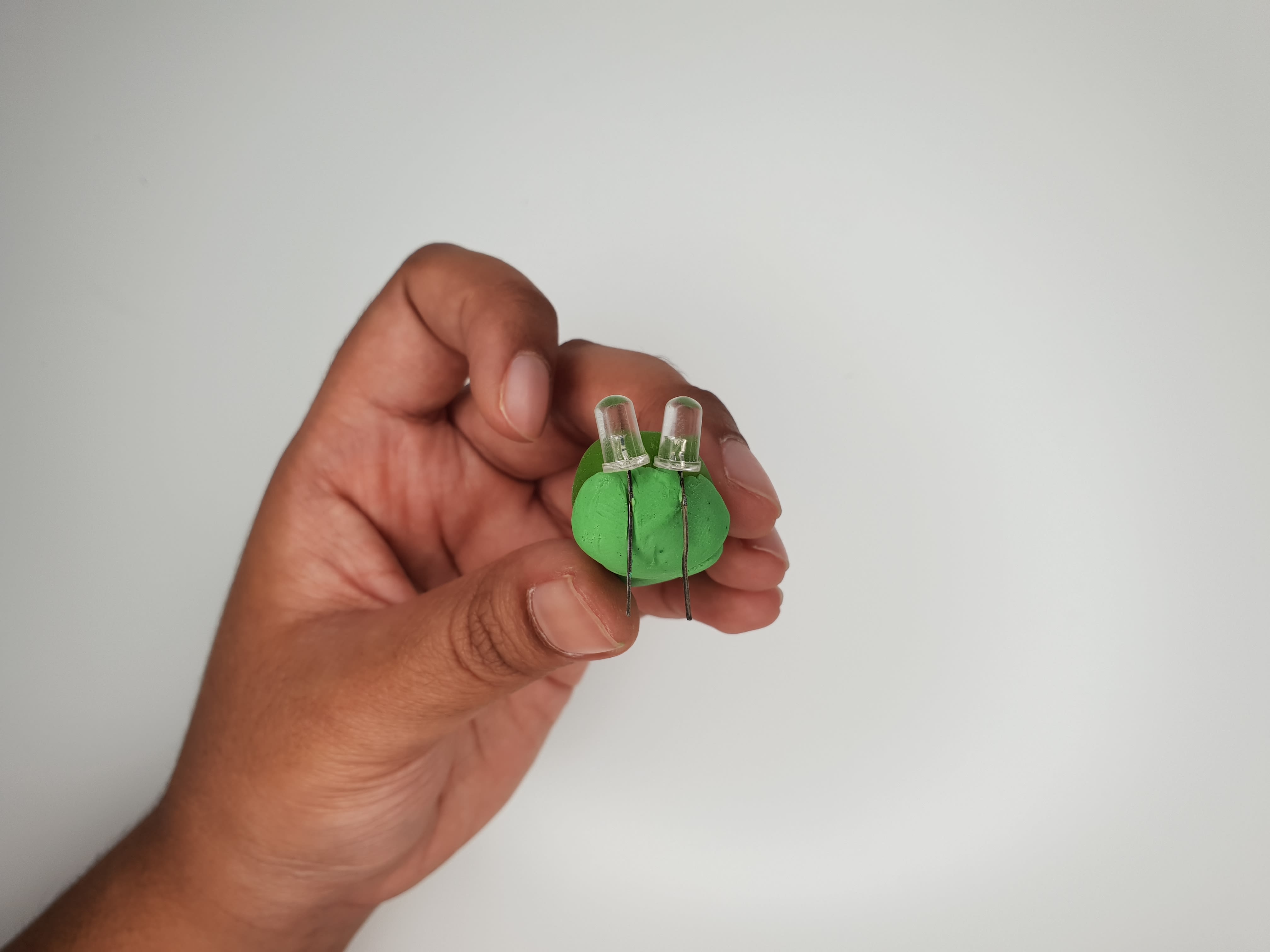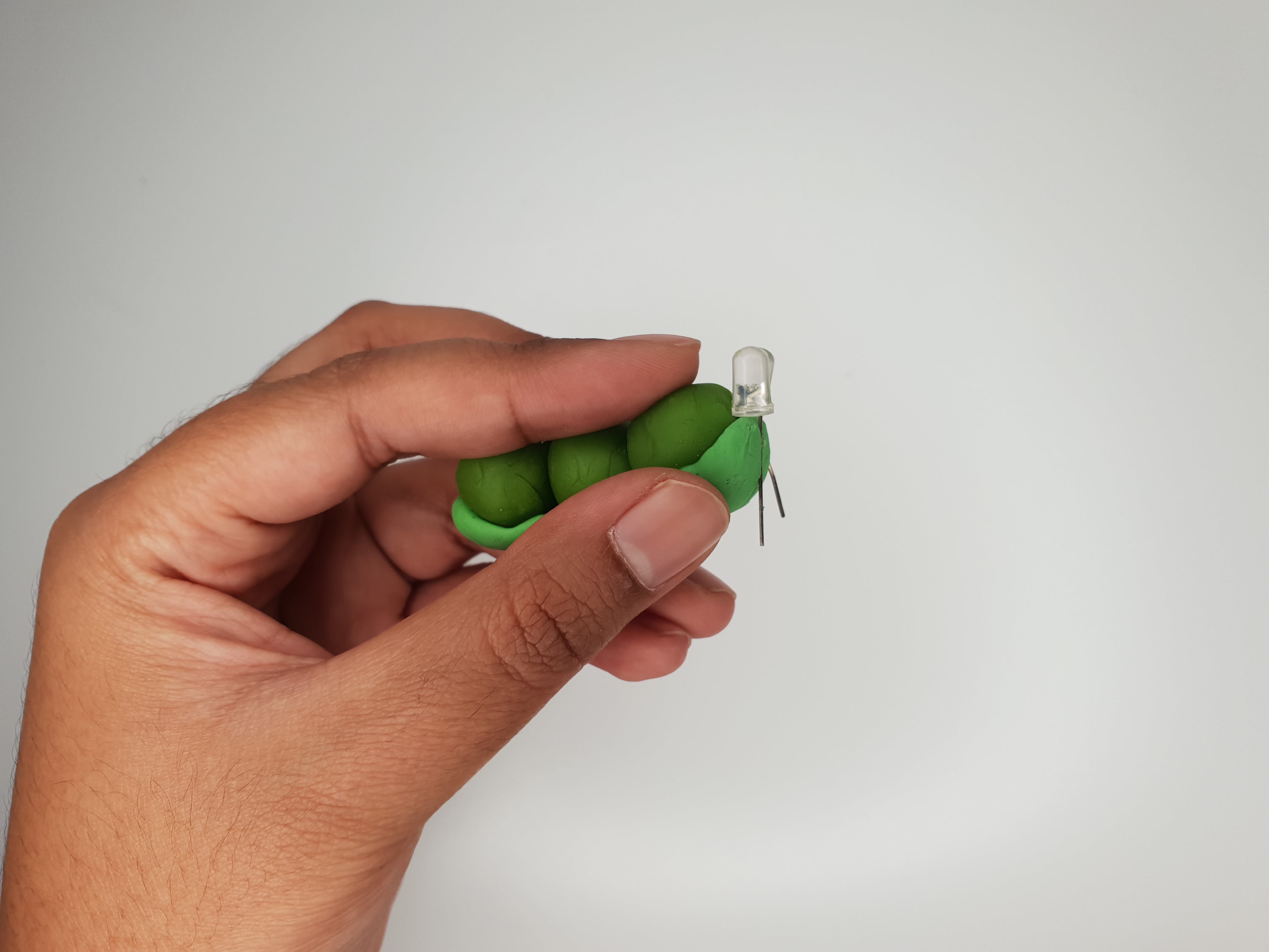 To make its eyes light up, poke the shorter end (negative terminal) of the LED into the caterpillar. Ensure that there is enough insulation in between the LED pins, to prevent any short circuit