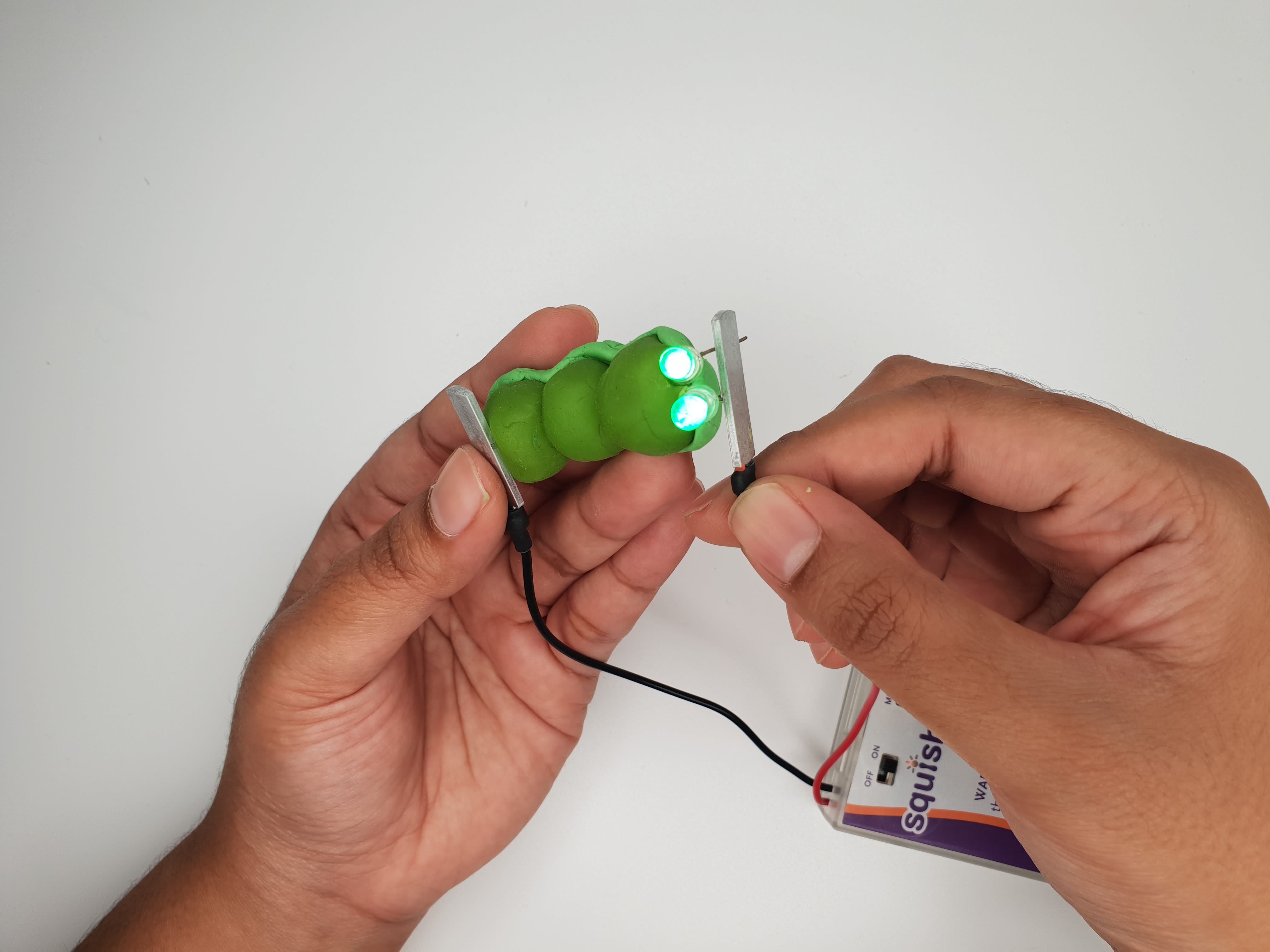 Slot in the positive plate of the battery pack in between the leaves. To close the circuit, place the negative plate onto the caterpillar's body. It's eyes should light up