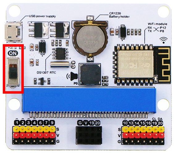 The USB power supply connector is in the upper left hand corner of the IoT:bit. Don’t forget to turn on the power switch on the left, too.